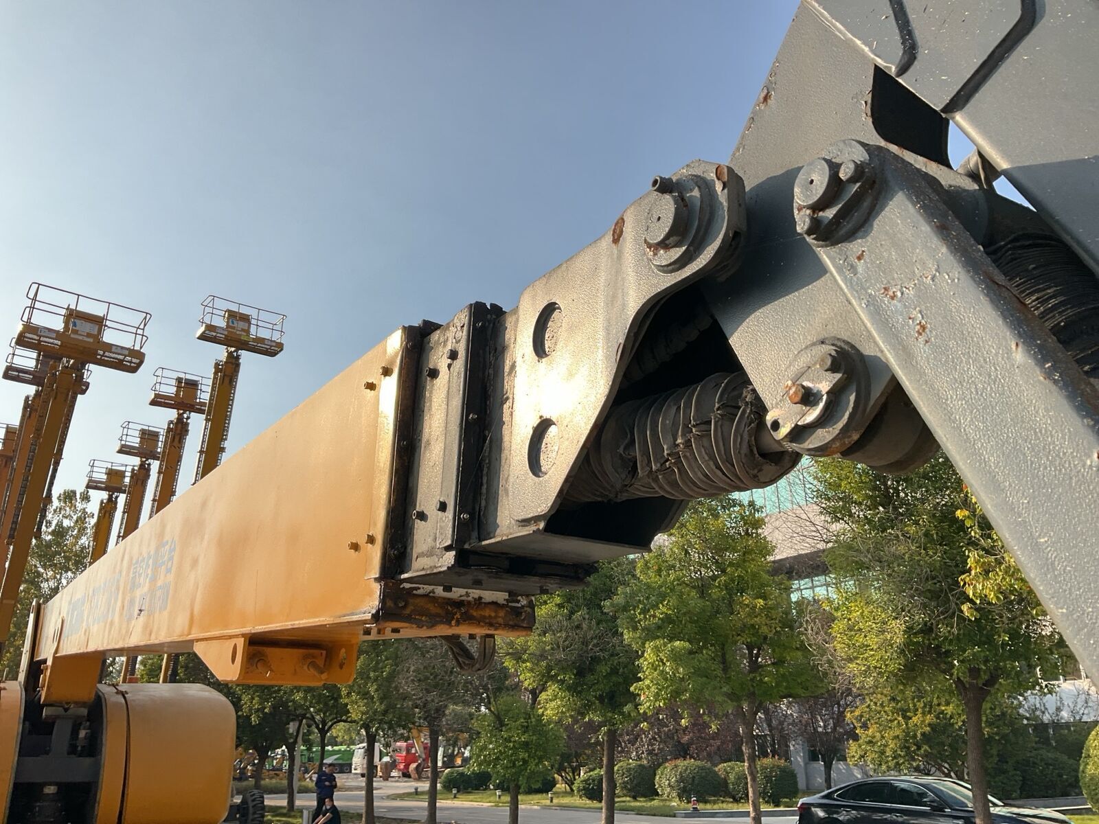 The boom driven by a single cylinder and the synchronously amplitude-varying and lifted stand column enhance the operating speed, and realize the fast access to the construction area, which will improve the construction efficiency.