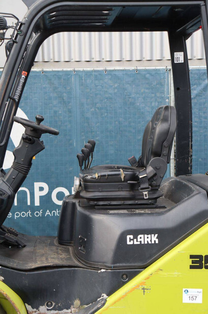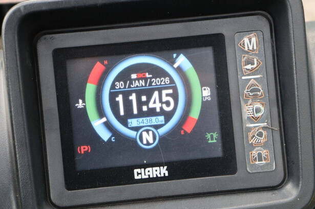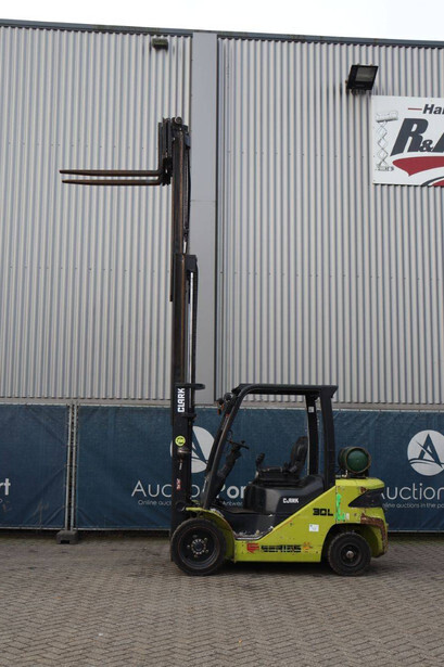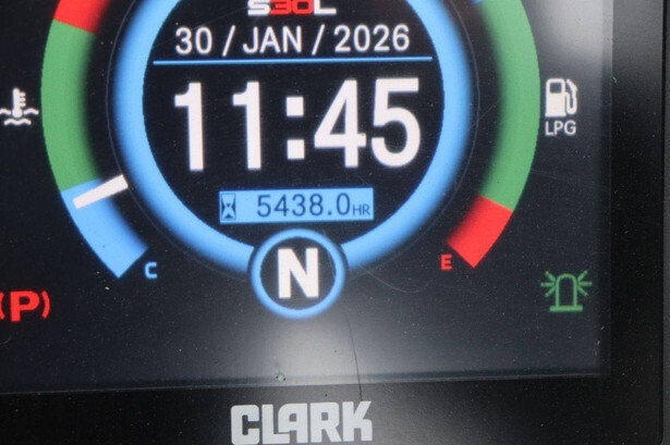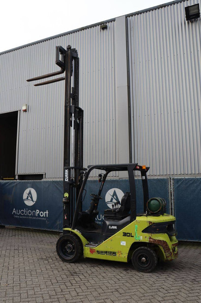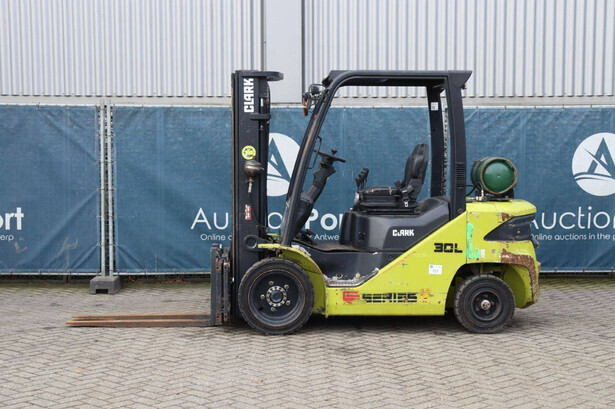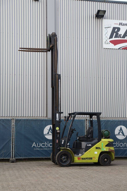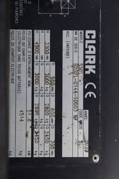 Brand: Clark Type: S30L Serial number: S232L014410003KF Year of construction: 2019 Fuel: LPG Mast type: Plywood Sideshift: Yes Lifting capacity: 3000 kg Lifting height: 4800 mm Recorded operating hours: 5438 h Machine weight: 4514 kg Tires: Solid tires Color: yellow