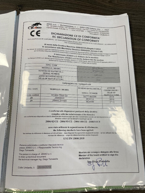 * 2019 * Diesel and 400-volt drive * 638 working hours * 2400 kg lifting capacity * 15-meter working height * 11.8-meter horizontal reach * Remote control * Jib 800.2H1MX * 2500 kg net weight * Includes documents