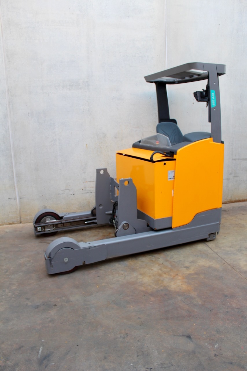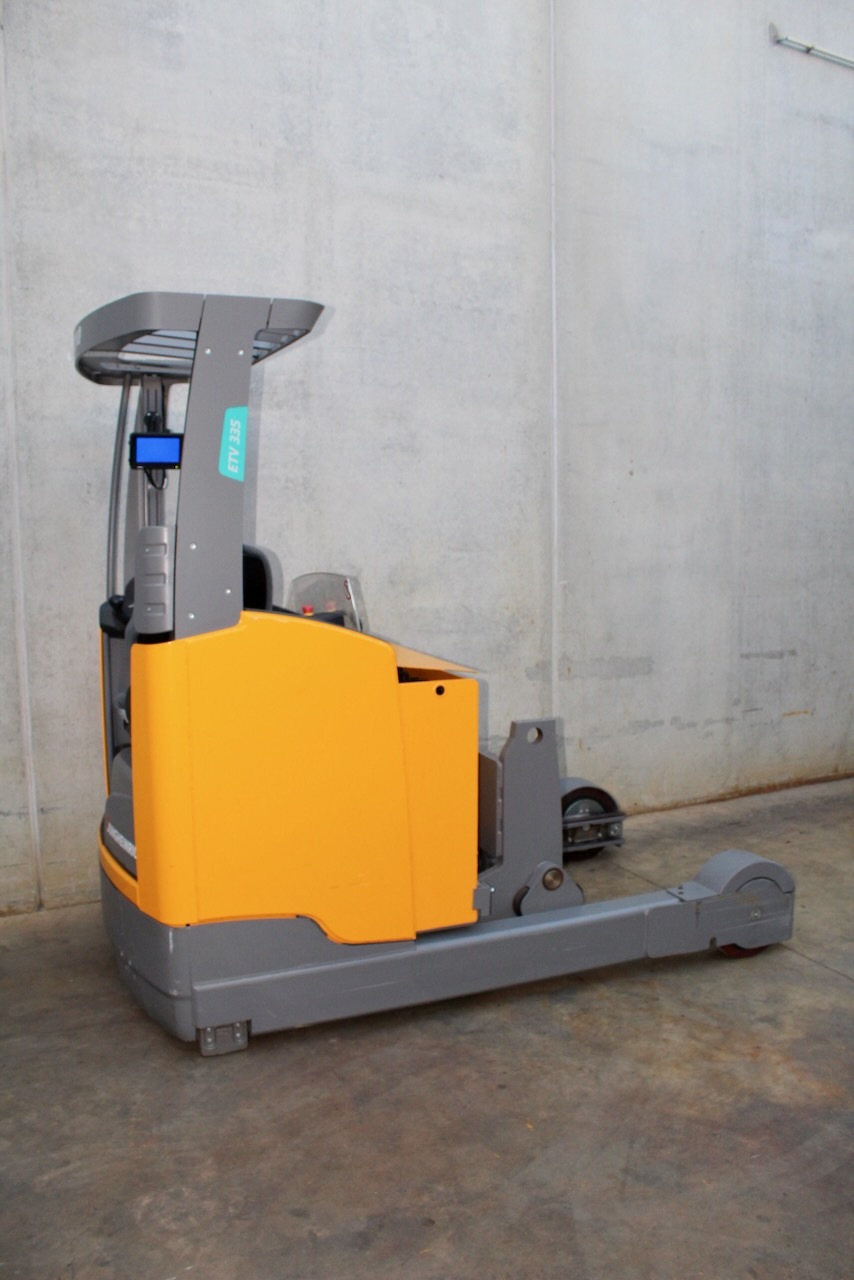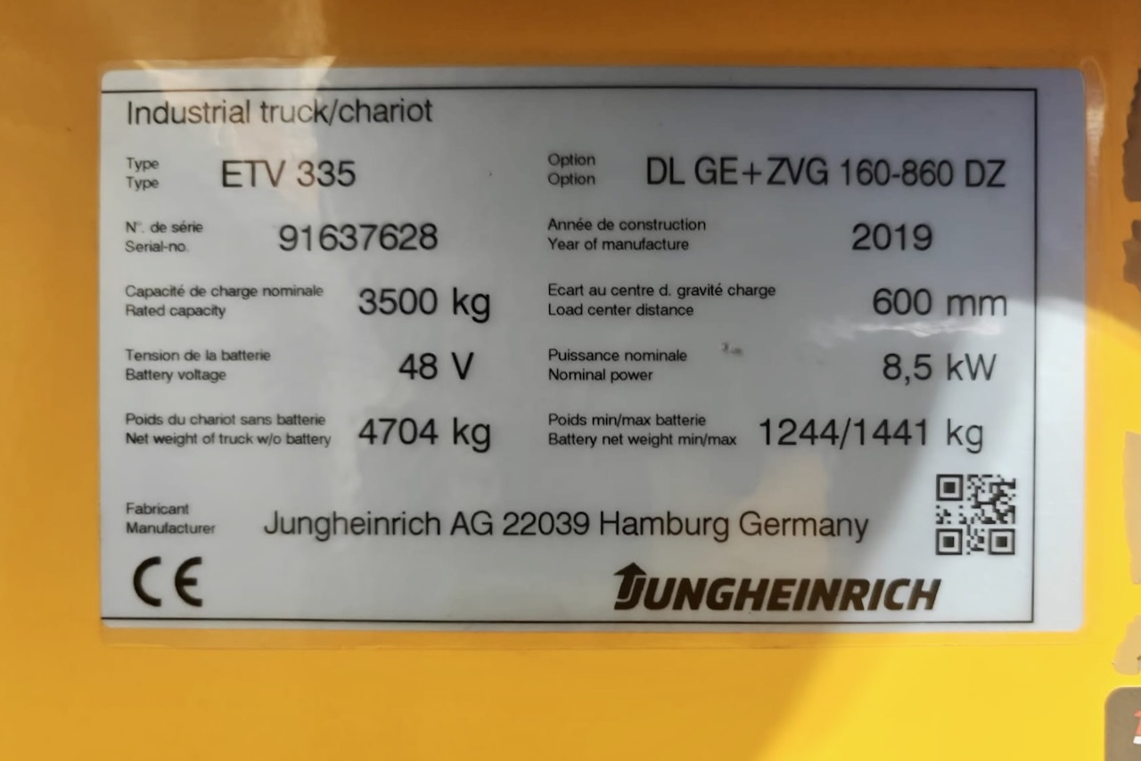 Jungheinrich ETV 335 860 DZ Load capacity: 3.500 Kg Lifting height: 8.600 mm Mast: Triplex Fork: 1.600 mm Build height: 3.830 mm Motorization: Electric Battery: No Charger: 48 v Very Good condition, WITHOUT BATTERY (Optional New battery 48v/930Ah +4.800€), Forks positioner with side-shift (Max width 1850mm, min 550mm)