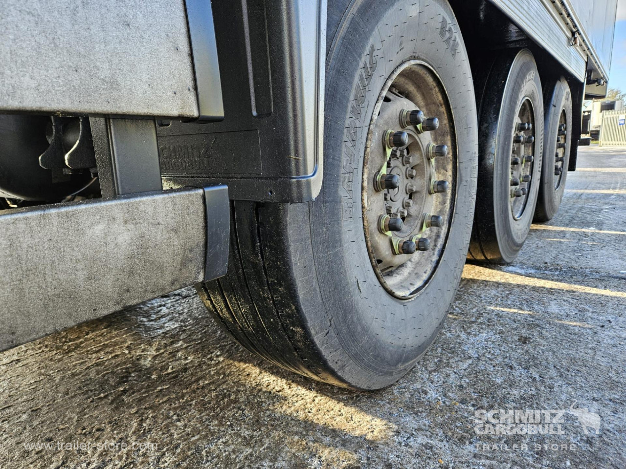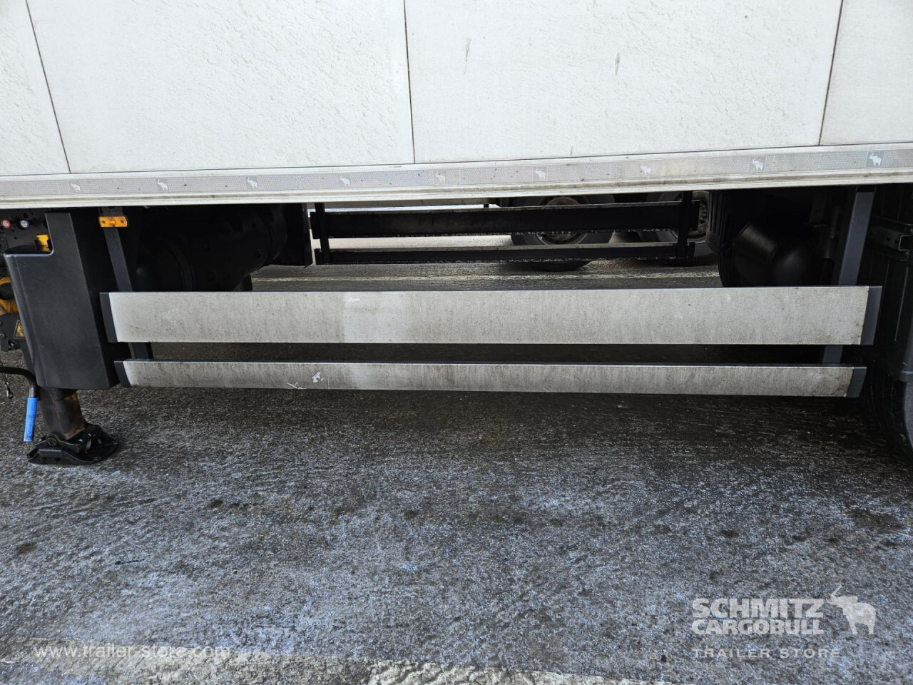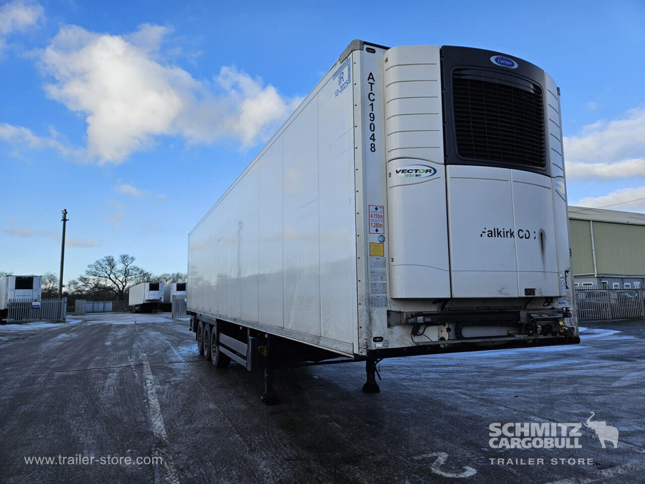 Remarks: **Safety**\\Rear underrun, Antilock Braking System ABS\\\\**Exterior**\\Air suspension, Toolbox, Ferry lashings, 1x15 and 2x7 pin plug, Antispray\\\\**Further equipment**\\2 LED reverse (Banksman) lights on rear.5 Bar tread plate floor.Pair of V7 load securing rails.LED side marker lights coupled with indicators.Ultra bright interior lighting without rotary switch.\\\\**Cargo securing**\\Load securing rail\\\\**Brake system**\\Disc brake, Schmitz ROTOS\\\\**Floor**\\Aluminum floor\\\\**Cooling unit**\\Carrier Vector 1950 MT, Diesel/Elektro, 8.182 Operating hours Diesel, 1.746 Operating hours electric\\\\**Loading area**\\Length 13.403 mm, Width 2.490 mm, Height 2.600 mm, Volume 86 m³\\\\**Tyre sizes**\\ 385/65 R22.5 , 385/65 R22.5 , 385/65 R22.5\\\\**Other dimensions and weights**\\Payload: 30.424 kg, GVW: 39.000 kg, Wheel base: 7.600 mm\\\\----