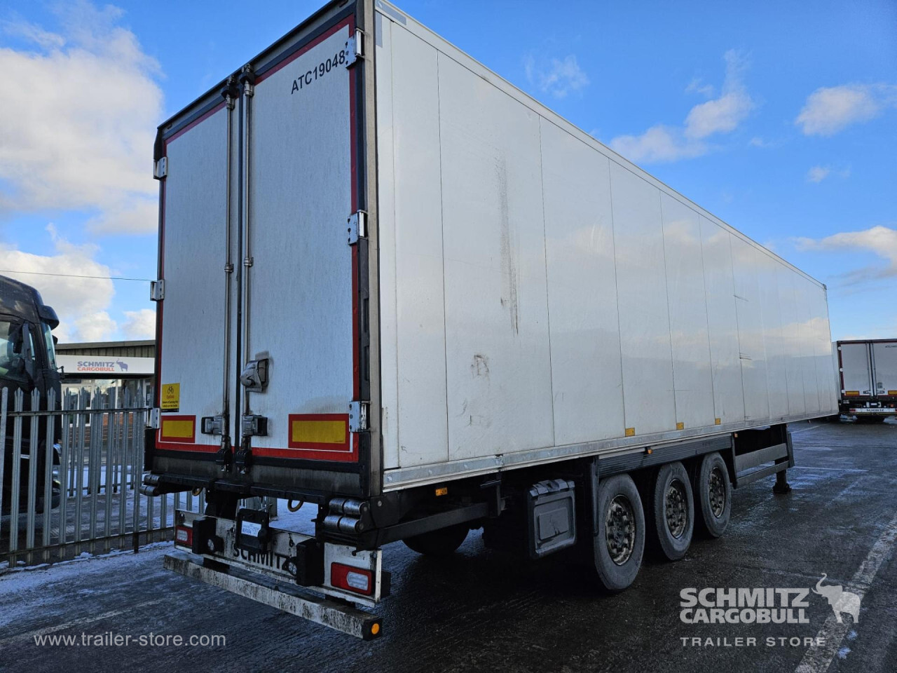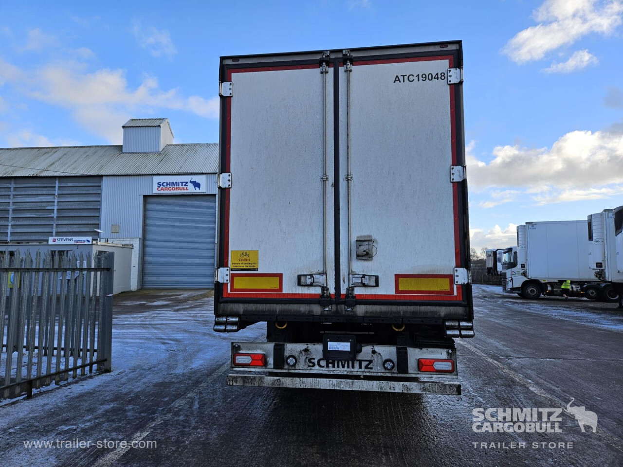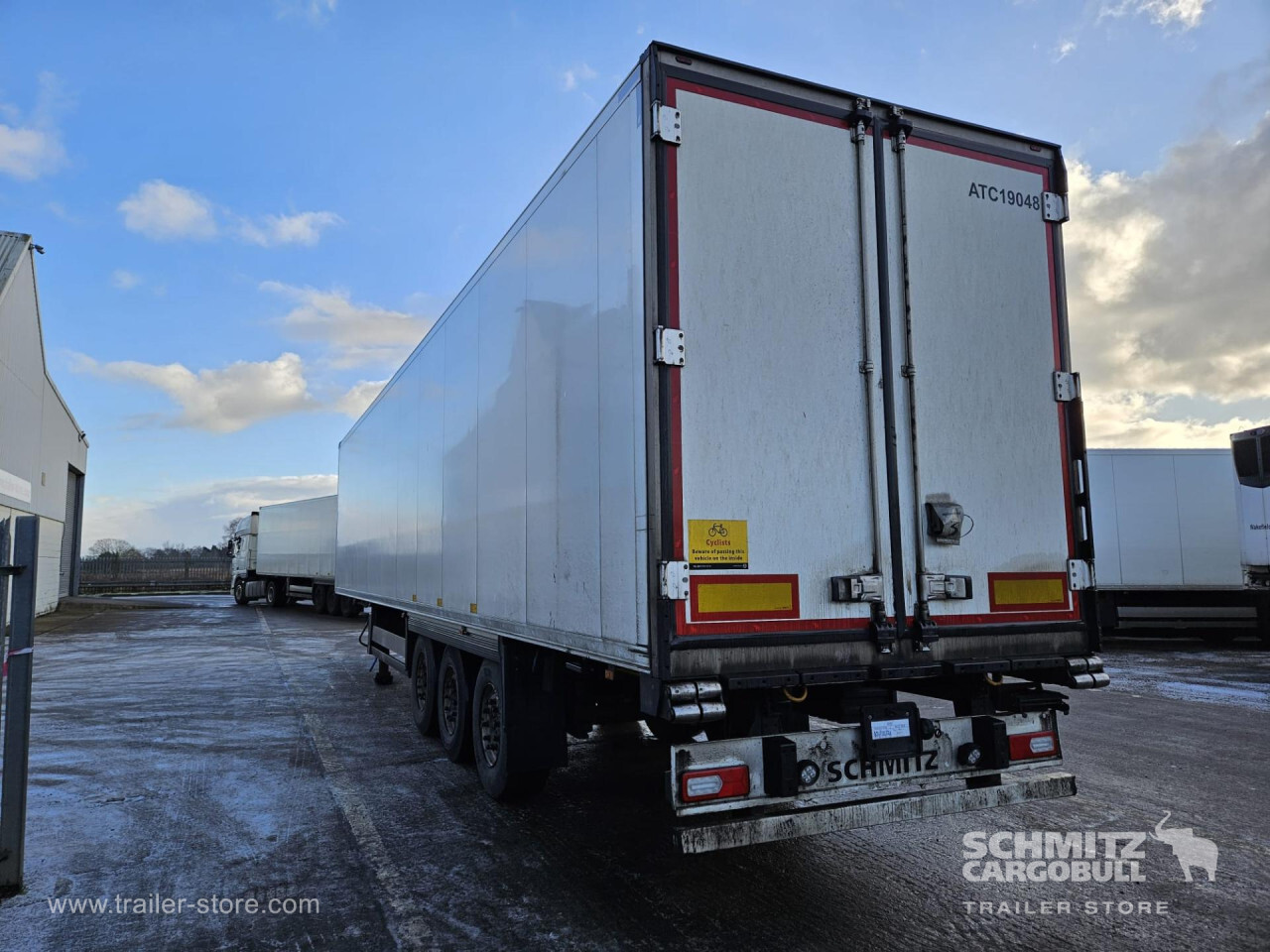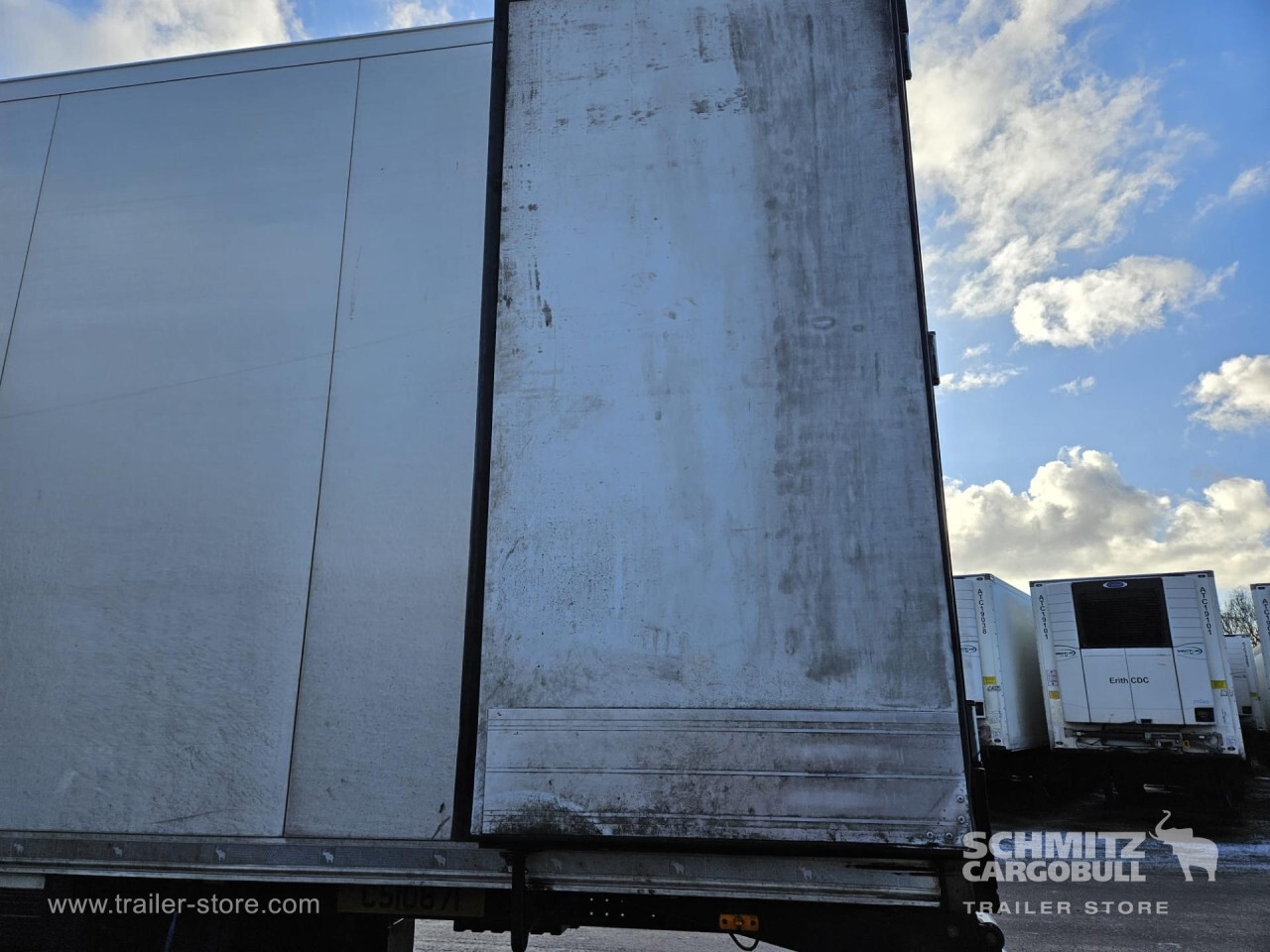 Remarks: **Safety**\\Rear underrun, Antilock Braking System ABS\\\\**Exterior**\\Air suspension, Toolbox, Ferry lashings, 1x15 and 2x7 pin plug, Antispray\\\\**Further equipment**\\2 LED reverse (Banksman) lights on rear.5 Bar tread plate floor.Pair of V7 load securing rails.LED side marker lights coupled with indicators.Ultra bright interior lighting without rotary switch.\\\\**Cargo securing**\\Load securing rail\\\\**Brake system**\\Disc brake, Schmitz ROTOS\\\\**Floor**\\Aluminum floor\\\\**Cooling unit**\\Carrier Vector 1950 MT, Diesel/Elektro, 8.182 Operating hours Diesel, 1.746 Operating hours electric\\\\**Loading area**\\Length 13.403 mm, Width 2.490 mm, Height 2.600 mm, Volume 86 m³\\\\**Tyre sizes**\\ 385/65 R22.5 , 385/65 R22.5 , 385/65 R22.5\\\\**Other dimensions and weights**\\Payload: 30.424 kg, GVW: 39.000 kg, Wheel base: 7.600 mm\\\\----