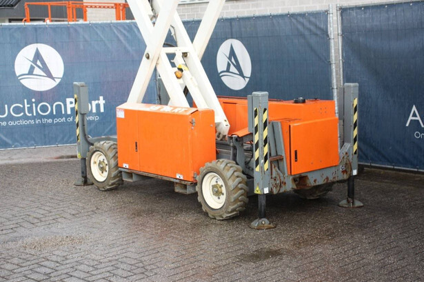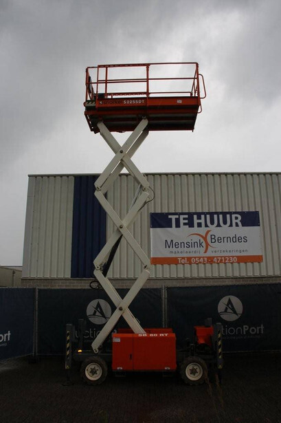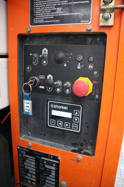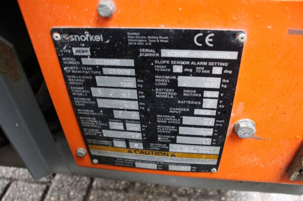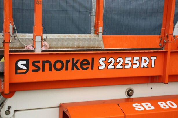 Brand: Snorkel Type: S2255RT Serial number: S2255RT-01-19070006 Year of construction: 2019 Fuel: Diesel Lifting capacity: 420 kg Working height: 8.5 m Operating hours read: 556 h Machine weight: 2360 kg Chassis: Wheels Type: Scissor lift Tires: Non-marking tires Color: orange