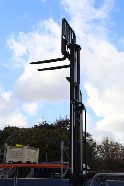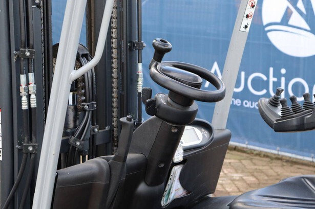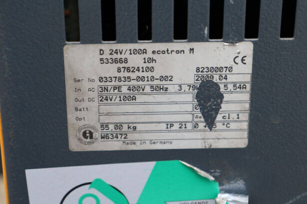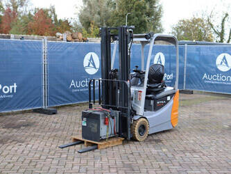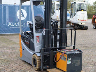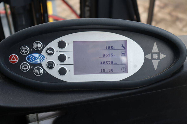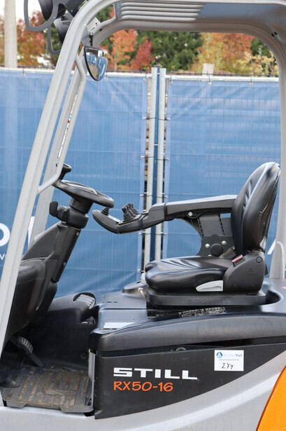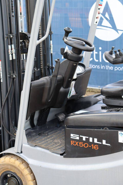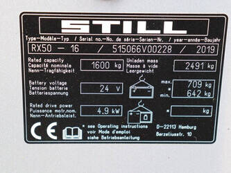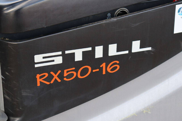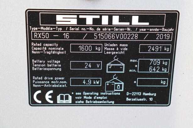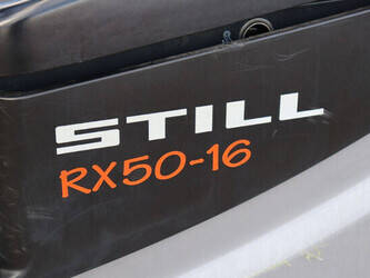 Brand: Still Type: RX50-16 Serial number: 515066V00228 Year of construction: 2019 Fuel: Electric Mast type: Triplex Sideshift: Yes Lifting capacity: 1600 kg Lifting height: 4920 mm Reading operating hours: 9315 h Machine weight: 3200 kg Tires: Non-marking tires Color: orange