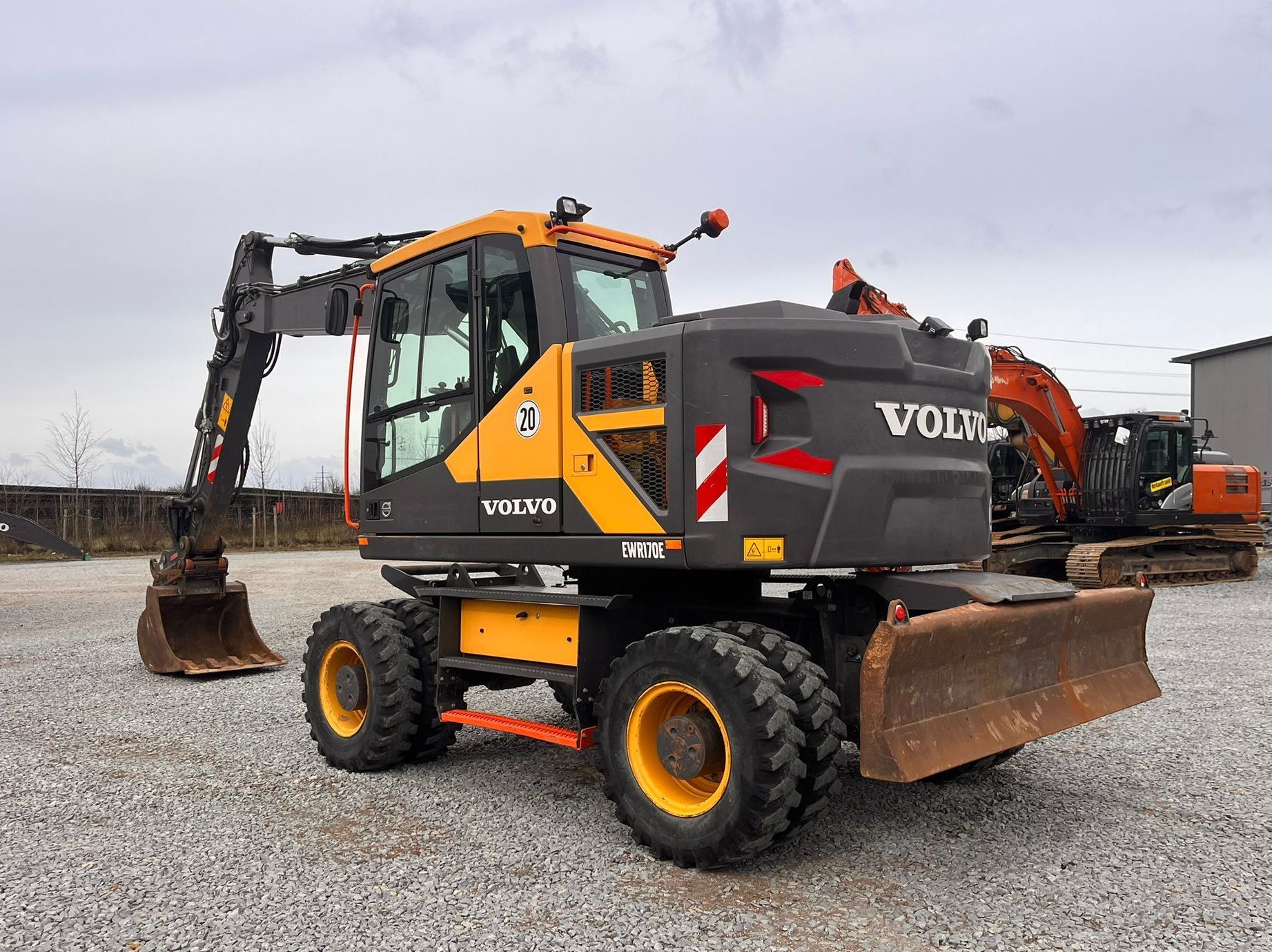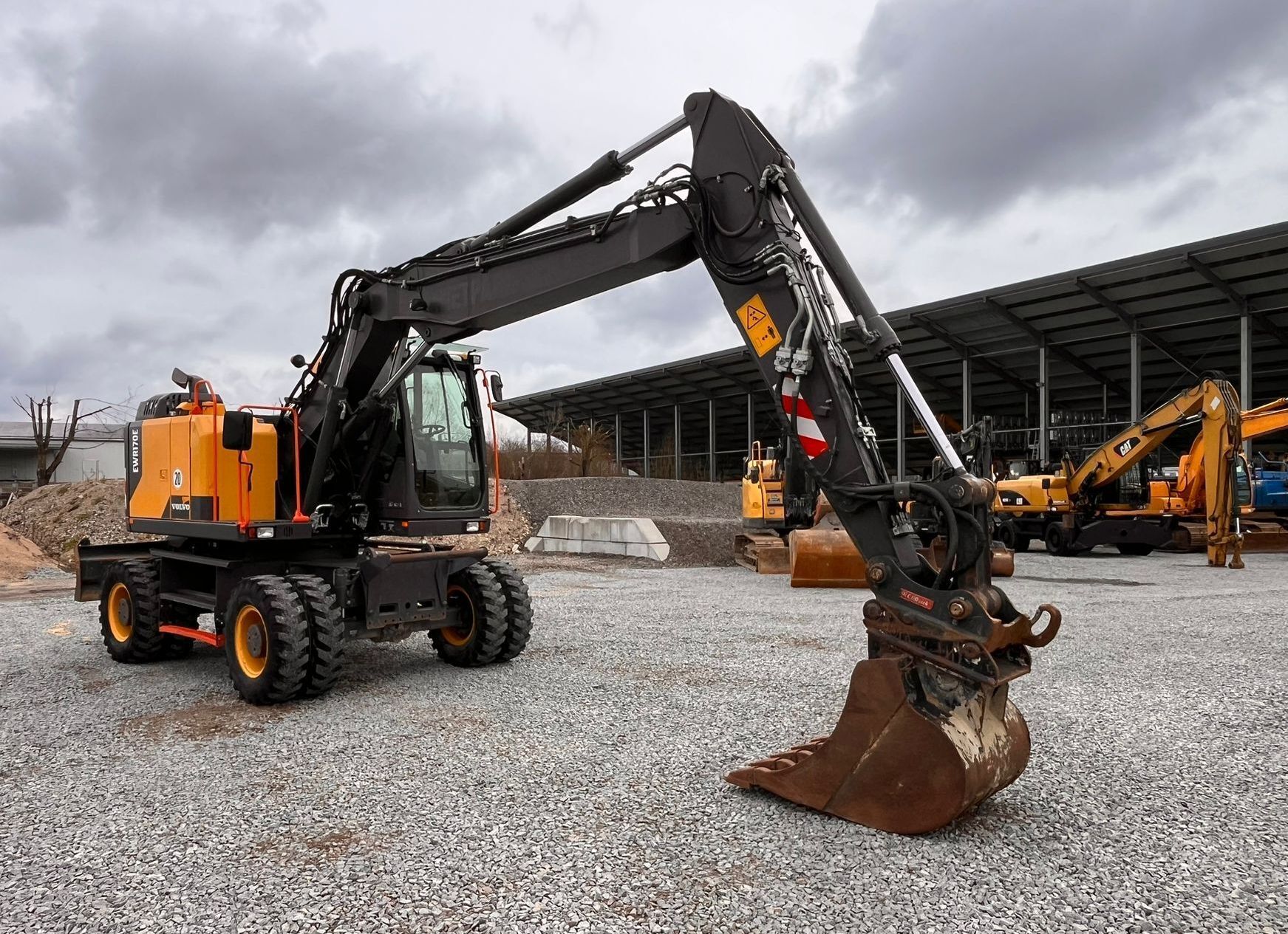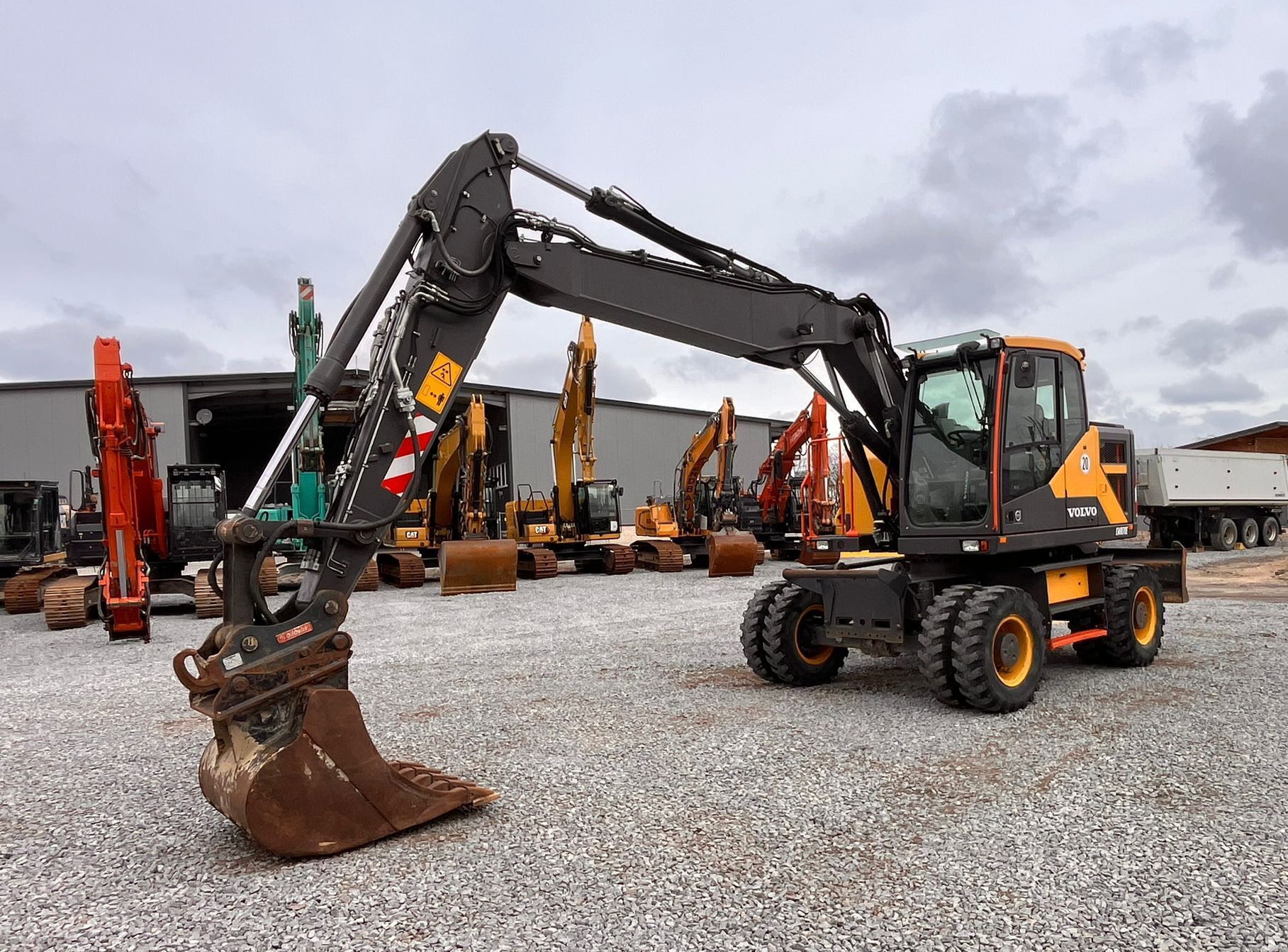 Volvo EWR170E Weight around ca 19,200 kg Engine / Type Volvo D4J Power / HP / KW 156 / 115 Emission standard V Boom / type Adjustable boom Length of stick 3.100mm Hydraulic lines Hammer-, Grapple-, Crusherlines Tires / type / size 10.00-20 *front in % good ca 30% good *back in % good ca 30% good Stabilising Blade Speed 20 km/h Attachments (content ca. / Type) Bucket Quick coupler (brand) Oil Quick OQ65 Aircondition Aircondition Central lubrication Central lubrication CE-certificate CE certified Location Plattling, Germany other details Track 2.75m, LED working lights,