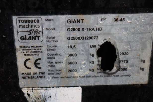 Brand: Giant Type: G2500 X-TRA HD Serial number: G2500XH20072 Year of construction: 2020 Fuel: Diesel Engine power: 18.0 kW Operating hours read: 924 h Machine weight: 3800 kg Tires: Pneumatic tires Color: green