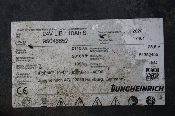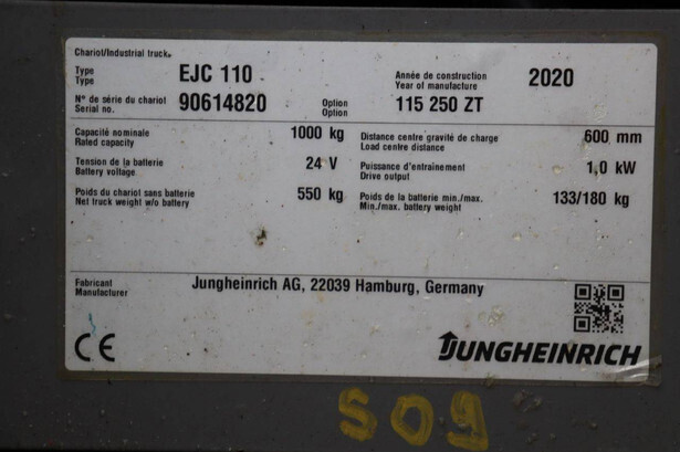 Brand: Jungheinrich Type: EJC 110 Serial number: 90614820 Year of construction: 2020 Fuel: Electric Mast type: Duplex Lifting capacity: 1000 kg Lifting height: 2890 mm Operating hours read: 1247 h Machine weight: 689 kg Color: yellow