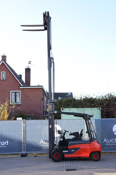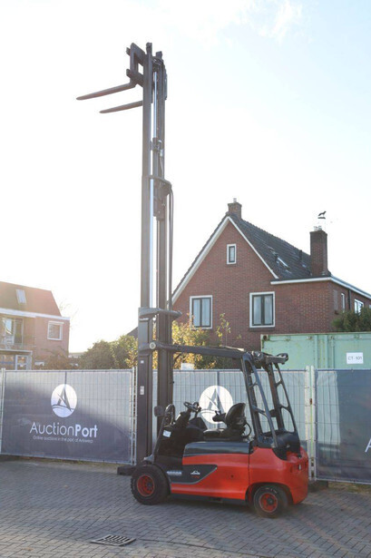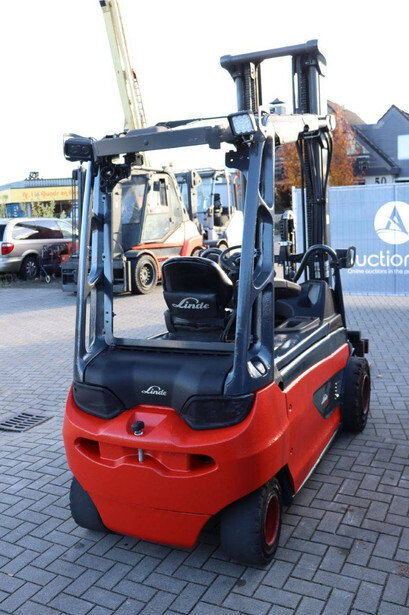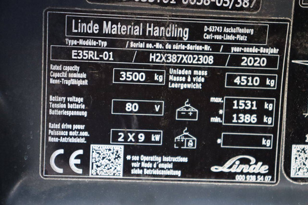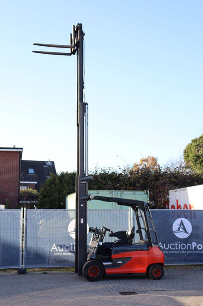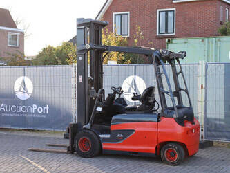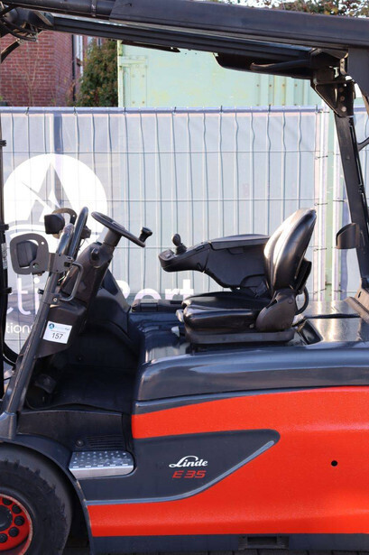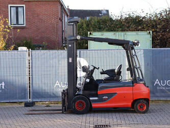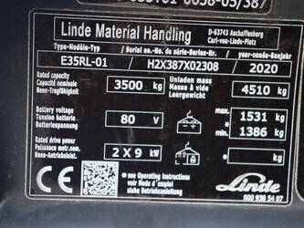 Brand: Linde Type: E35RL-01 Serial number: H2X387X02308 Year of construction: 2020 Fuel: Electric Mast type: Triplex Sideshift: Yes Lifting capacity: 3500 kg Lifting height: 8000 mm Operating hours read: 4988 h Machine weight: 6041 kg Tires: Solid tires Color: red