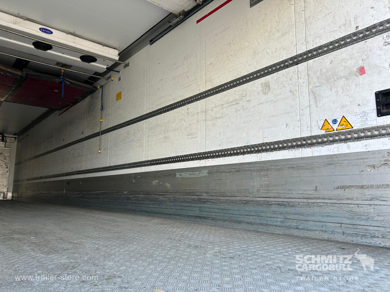 Remarks: **Safety**\\Rear underrun, Antilock Braking System ABS\\\\**Exterior**\\Air suspension, Taillift: Dhollandia 2T Slideout, Toolbox, Ferry lashings, 1x15 and 2x7 pin plug, Antispray\\\\**Cargo securing**\\Load securing rail\\\\**Brake system**\\Disc brake, Schmitz ROTOS\\\\**Floor**\\Aluminum floor\\\\**Cooling unit**\\Carrier Vector HE 19 MT, Diesel/Elektro\\\\**Loading area**\\Length 13.403 mm, Width 2.460 mm, Height 2.600 mm, Volume 85 m³\\\\**Tyre sizes**\\ 385/65 R22.5 , 385/65 R22.5 , 385/65 R22.5\\\\**Other dimensions and weights**\\Payload: 29.380 kg, GVW: 39.000 kg, Wheel base: 7.600 mm\\\\----