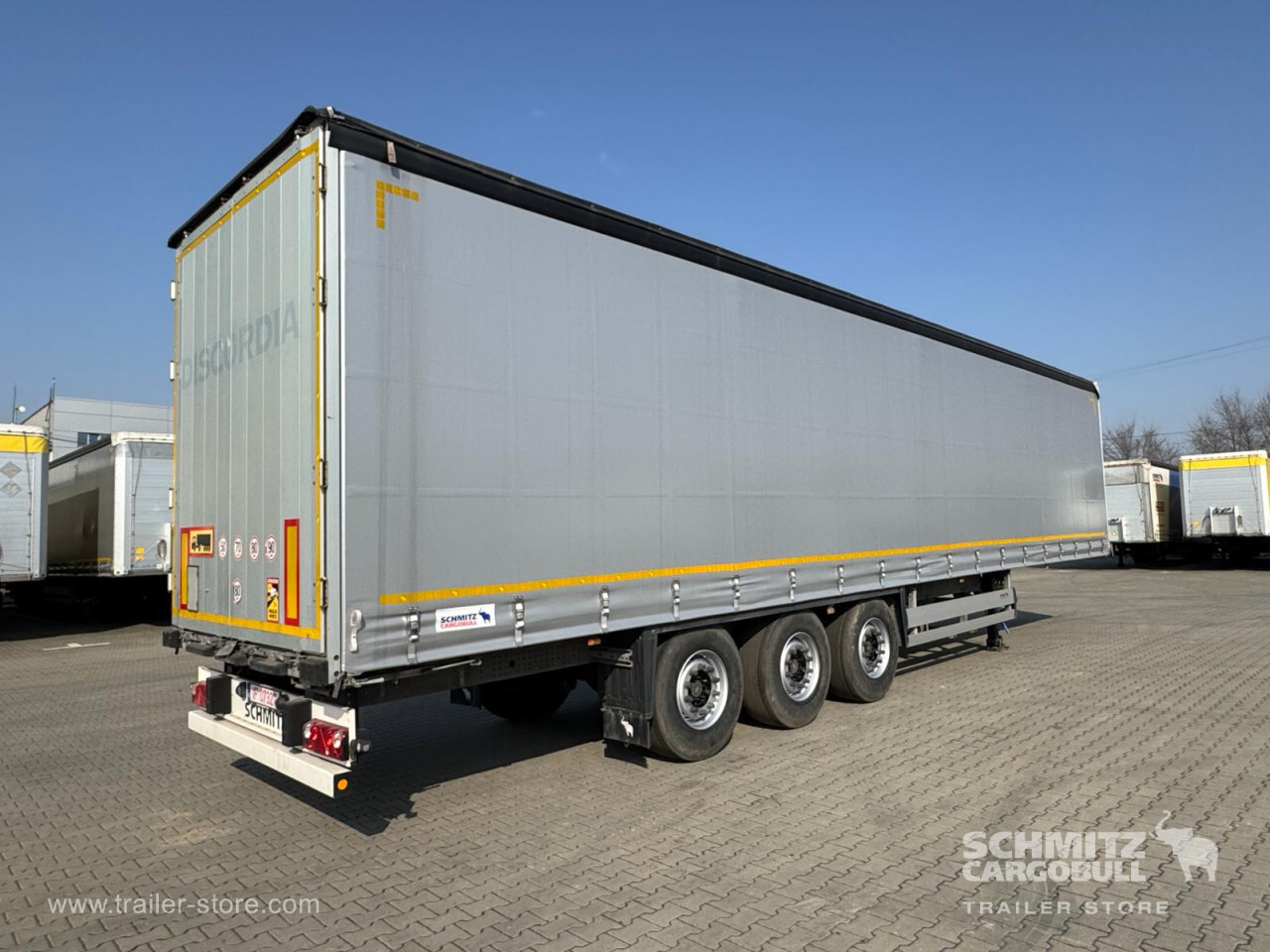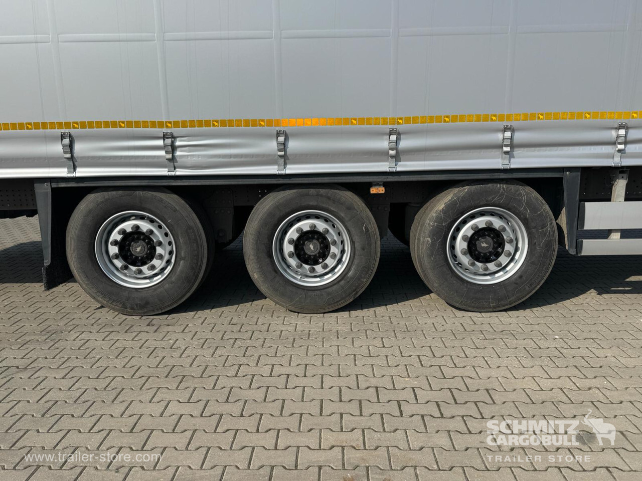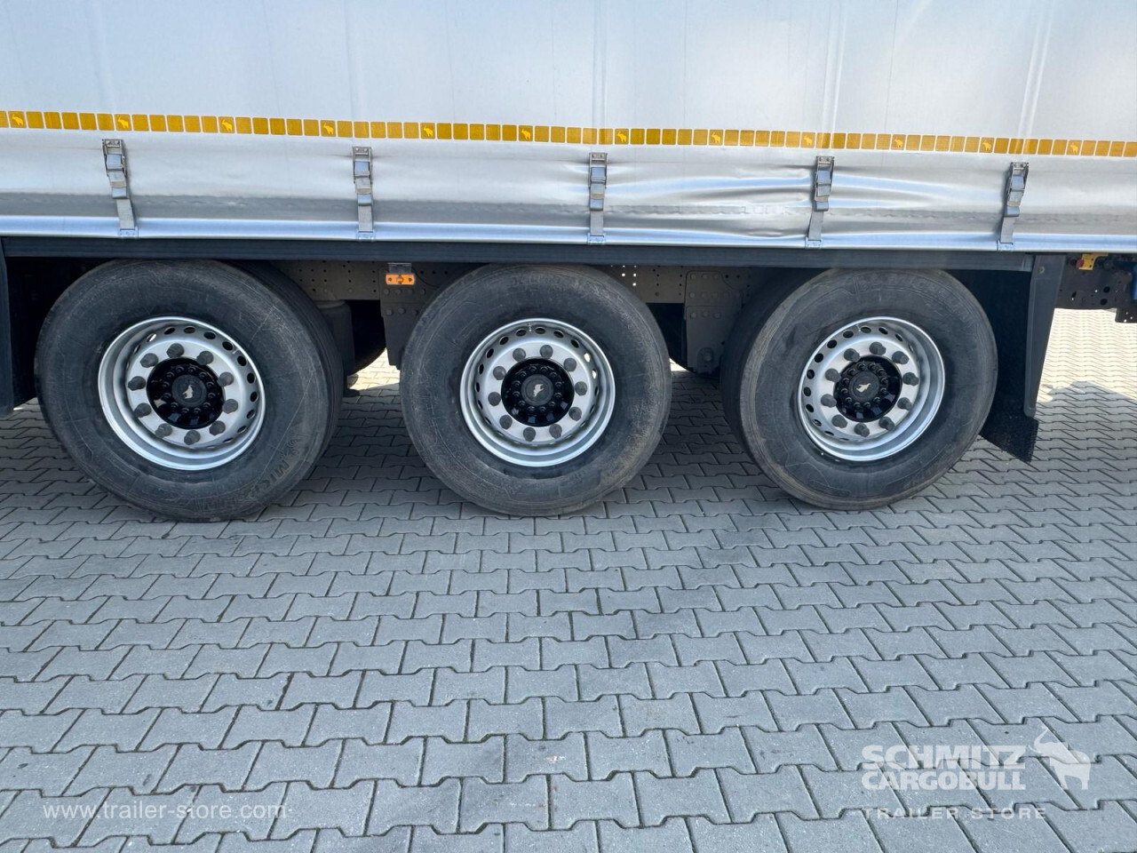 Remarks: **Safety**\\Rear underrun, Antilock Braking System ABS\\\\**Exterior**\\Air suspension, 1x15 and 2x7 pin plug, Antispray\\\\**Cargo securing**\\DIN EN 12642 (code XL) certificate\\\\**Brake system**\\Disc brake, Schmitz Cargobull\\\\**Floor**\\Wisadeck floor\\\\**Loading area**\\Length 13.620 mm, Width 2.480 mm, Height 2.780 mm, Volume 93 m³\\\\**Tyre sizes**\\1. Achse: 385/65 R22.5 , Tread depth: 11 mm / 11 mm, 2. Achse: 385/65 R22.5 , Tread depth: 11 mm / 11 mm, 3. Achse: 385/65 R22.5 , Tread depth: 11 mm / 11 mm\\\\**Other dimensions and weights**\\Wheel base: 7.700 mm\\\\----