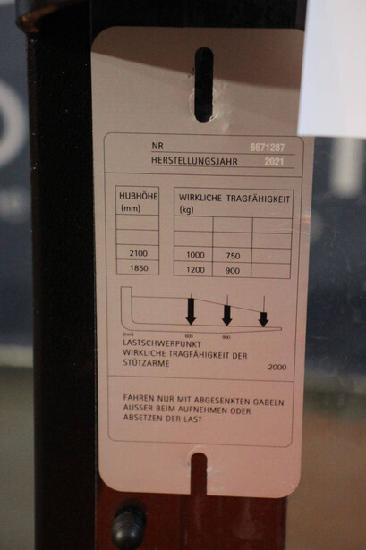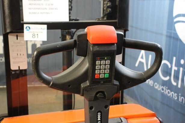 Brand: Toyota Type: SWE200D Serial number: 6671287 Year of construction: 2021 Fuel: Electric Mast type: Duplex Lifting capacity: 2000 kg Lifting height: 2100 mm Drive-through height: 1570 mm Reading operating hours: 2103 h Color: orange