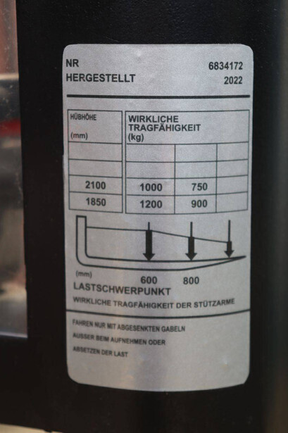 Brand: Toyota Type: SWE200D Serial number: 6834172 Year of construction: 2022 Fuel: Electric Lifting capacity: 1000 kg Recorded operating hours: 1442 h Color: orange