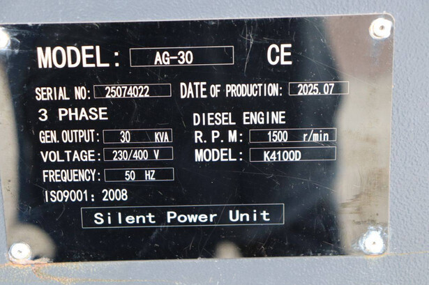 Brand: Dong Xin Power Type: AG-30 Serial number: 25074022 Year of construction: 2025 Fuel: Diesel Power: 30 kVA Voltage: 400 V Current: 43 A Color: gray