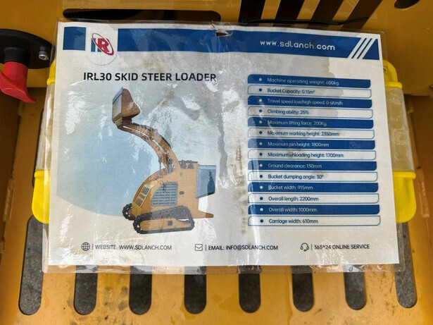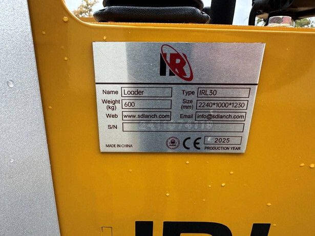 Skid steer loader: Brand: IR Type: IRL30 Year of construction: 2025 Serial number: 2411074119 Fuel: Gasoline Reading operating hours: 0 h Machine weight: 600 kg Running gear: Tracks Color: yellow Transport dimensions: 2240x1000x1230 mm