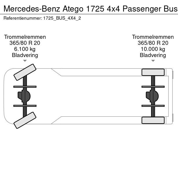 The Mercedes-Benz Atego 1725 4×4 Passenger Bus is a robust and versatile passenger bus, specially designed for comfortable and safe transport in challenging terrains. Thanks to its four-wheel drive, powerful engine and durable construction, this vehicle is ideal for both urban and remote areas. Specifications Mercedes-Benz Atego 1725 4×4 Passenger Bus: Engine: 6-cylinder diesel engine with 245 hp (180 kW), designed for reliability and performance. Drive: 4×4 drive with excellent off-road capabilities, ideal for difficult roads. Transmission: Manual transmission, tuned for smooth and efficient driving. Number of passengers: 29+1 passenger seats with seat belts. Lighting: Indoor and outdoor lighting for optimal visibility and safety. Suspension: Reinforced suspension for maximum driving comfort, even in rough terrain. Cabin & Passenger Area: - Ergonomic seats with sturdy upholstery and seat belts. - Optional air conditioning and heating for a pleasant climate. - Sturdy body with increased ground clearance for off-road use. - Spacious luggage compartment for luggage and equipment. Advantages: - Off-road capabilities: Designed for challenging environments. - Durability: High quality materials for extended use. - Comfort & Safety: Passenger-friendly design with good driving comfort. - Versatility: Suitable for many applications in urban and rugged areas.