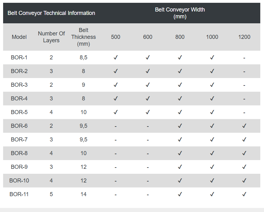 BOR Series conveyors are manufactured in different sizes to match plant requirements, with belt widths typically ranging from 500 mm to 1200 mm and lengths produced according to the required layout. The conveyors use an electric motor operating at 1500 rpm, and the belt is typically a 4 ply rubber belt with 10 mm or 12 mm thickness depending on duty. Impact rollers are used at feed points to reduce wear, and the system is designed for stable, controlled transport without spillage when correctly selected for the application.