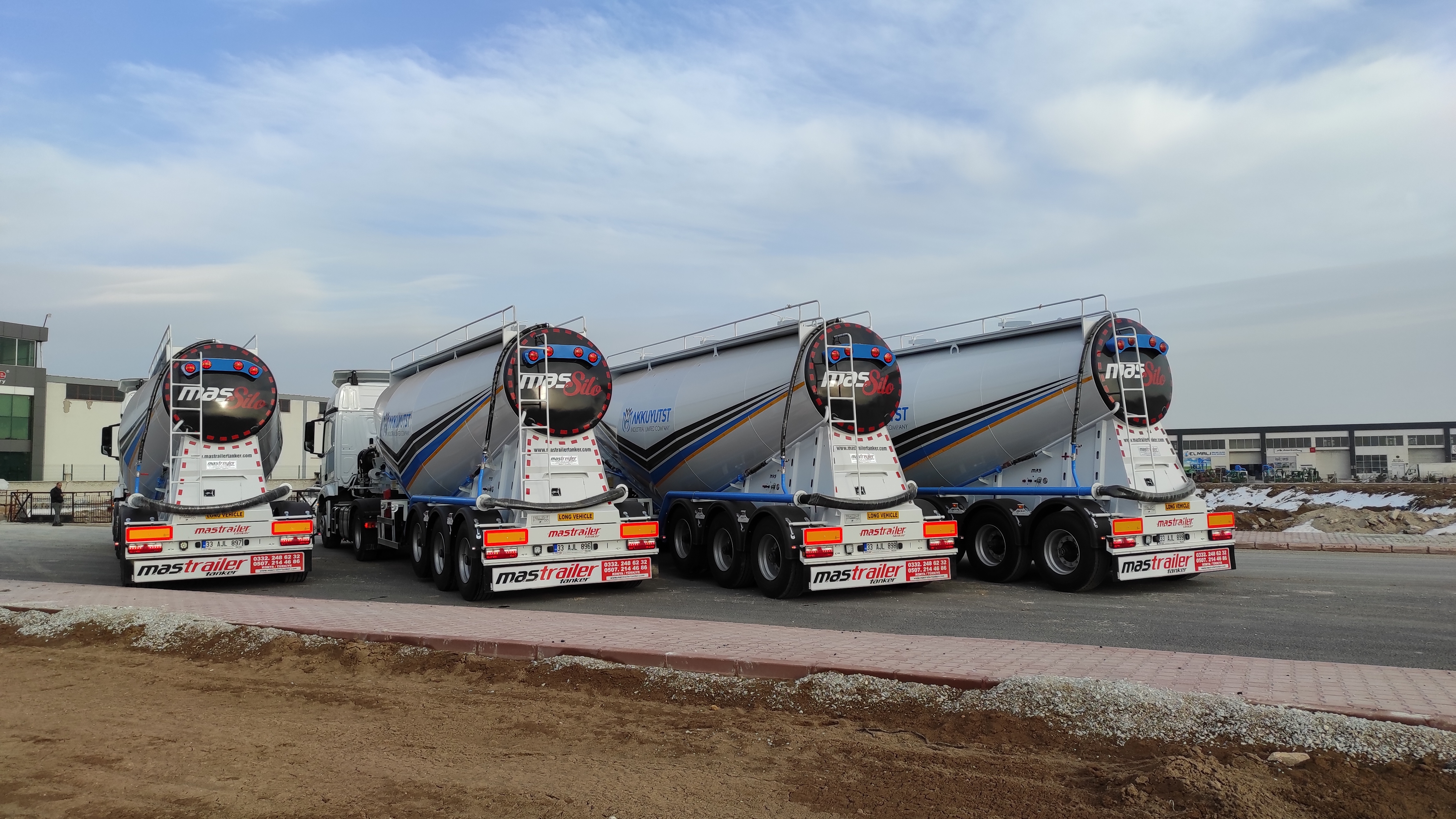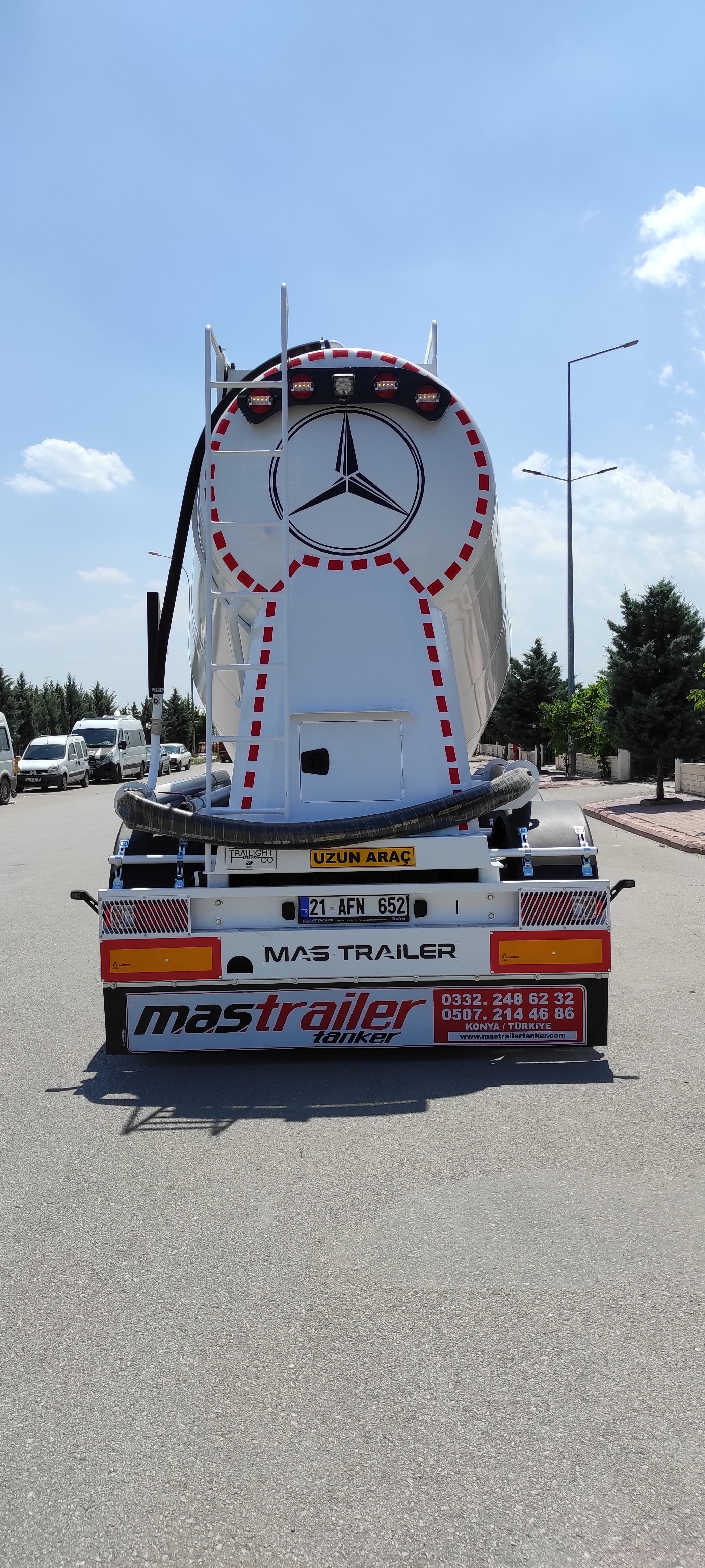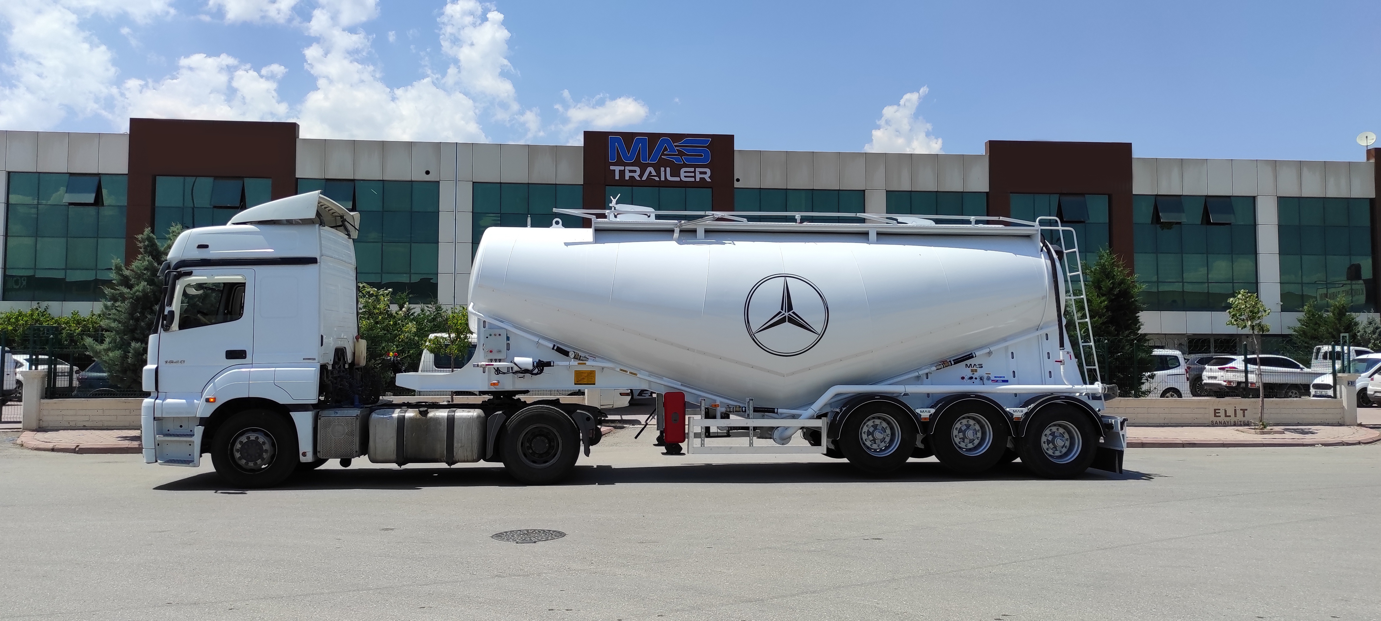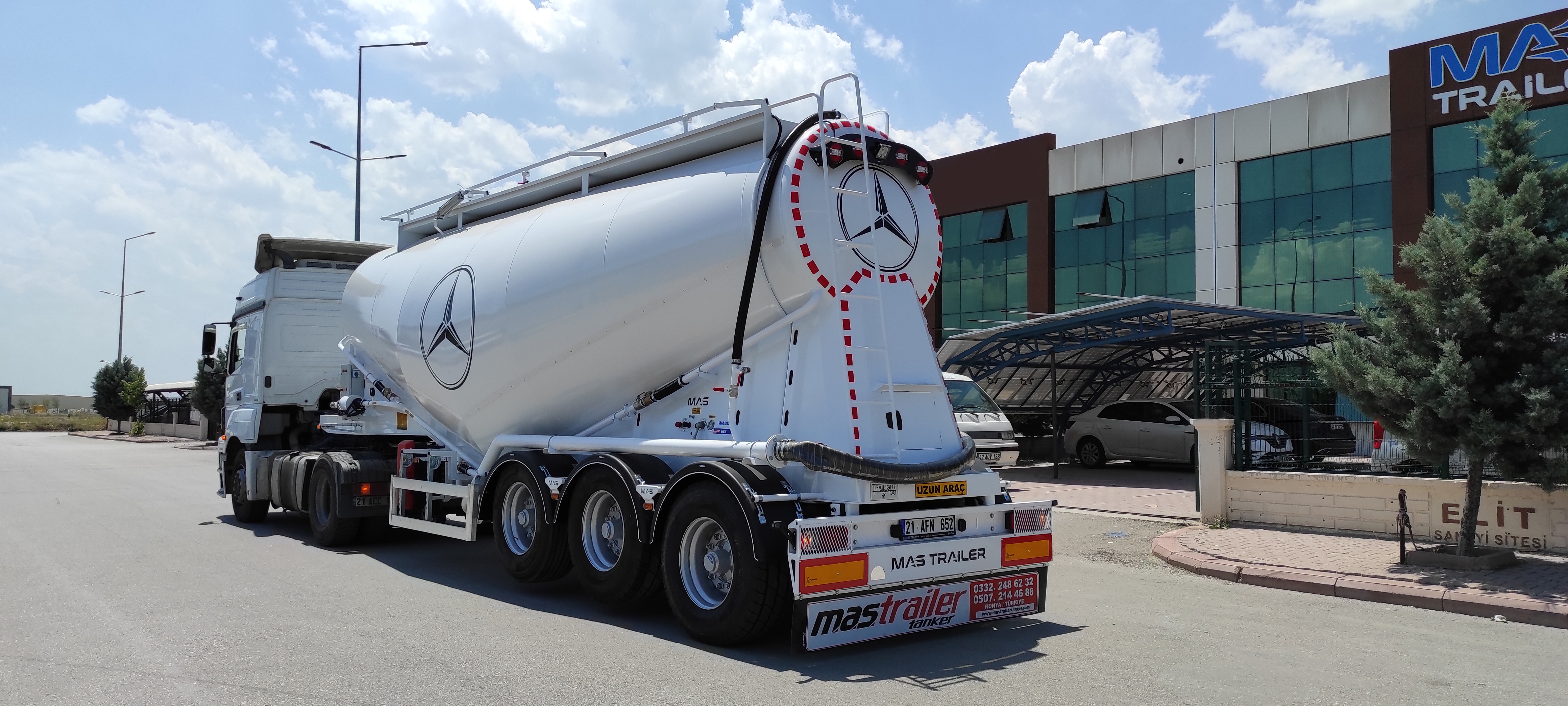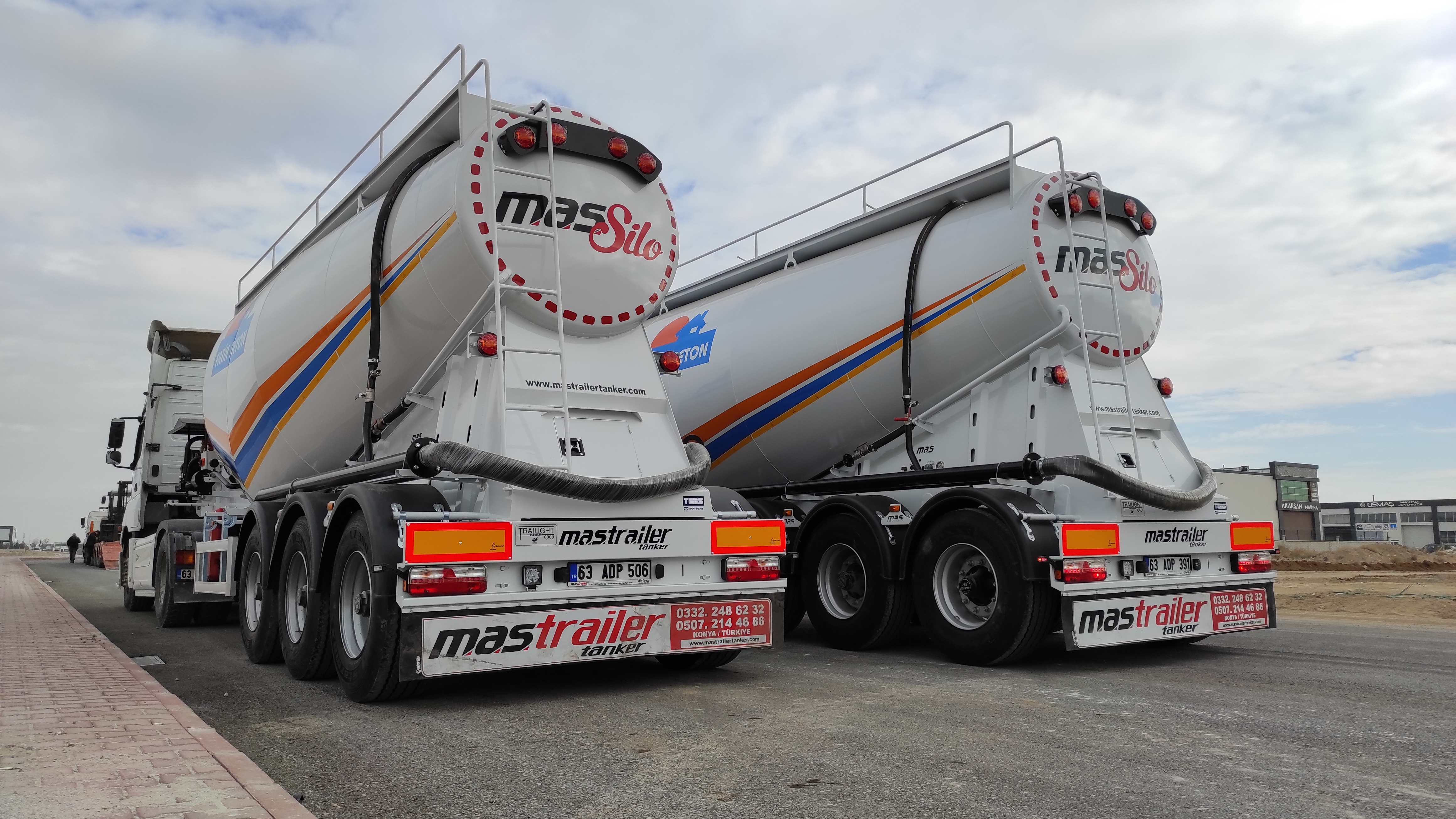 Brand Mas Trailer Tanker Model 2026 V Type Silobas Type: Silo Semi Trailer DIMENSIONS: Length: 10250mm Width: 2550 mm maximum Height: 3850mm Pin - ground clearance: 1,250 mm Distance between axles: 1310 mm BOILER FEATURES Volume : 30-32 m³ (38 tons) Type : V type bottom outlet Tank thickness : 4mm Working pressure : 2 bars Test pressure : 2.20 bars Discharge Time : 28 min. BODY FEATURES The tank material is manufactured from 6052 -6252 quality ERDEMİR or İSDEMİR flat steel. It is subjected to pressure and leakage tests before painting. COMPRESSOR BNB 102 Electric Compressor Confidence brand will be used. (2 Piston) BNB 72 Electric Compressor Confidence brand will be used. (3 Piston) Esinti 102-E Electric Compressor Bekomsan brand will be used. (2 Piston) Esinti 72-E Electric Compressor Bekomsan brand will be used. (3 Piston) G-220-2 E Electric Compressor Globaltech brand will be used. (2 Piston) G-160-3 E Electric Compressor Globaltech brand will be used. (3 Piston) The compressor has a motor protection star-stop panel. TANK EQUIPMENT 2 single-closing, test pressure resistant manhole covers, 450 mm in diameter 1 piece 4” Air controlled Pinch valve 1 air pressure manometer 1 piece ball jet air valve to accelerate discharge 1 piece with exit from the left rear of the vehicle4”wolf mouth connected discharge system 1 piece of safety valve set to 2.5 bar (On the body) Hose system with internal discharge air channel providing fluidity (13 rows) Axle: Three Turkish brand axles, each with a carrying capacity of 9 tons, are used. It has air suspension. The front axle is lifted and can be controlled from the driver's cabin. BRAKE SYSTEM: Knor or Wabco brand products are used in the brake equipment designed according to European rules. It is equipped with Automatic Brake Slack Adjusters, Brake Valve, Brake Chambers (30 cylinder), Brake Pads (394x200), Axle Brakes (4 Sensor 2 Module EBS system). There are 2 replaceable and protected brake sockets at the front of the trailer. 60+60 lt capacity air tank is installed. ELECTRICAL SYSTEM: Saba Brand 2x7 pin sockets - 24V, lights compliant with SAE standards. Rear stop lights, side marker lights, brake safety warning lights and signal lights will be installed. There will be 2 tail and stop combined lamps. 2 turn signal combination lamps will be installed 1 license plate light. The electrical system complies with European standards and is flame resistant. PARK FEET: OMS brand Parking Stands Telescopic, mechanical conveyor gear Dynamic Lifting Capacity : 25 Ton Static Lifting Capacity : 50 Ton Low Gear Position : 0.98 mm / Revolution TIRES AND RIMS: 385/65/R22.5STARMAX, PETLAS, Goodyear, Pirelli, Bridgestone (6 Pieces) 11.75 x 22.5, JANTSA rim (6 pieces) KING PIN: Turkish brand OMS will be used. It is a removable king pin from the bottom in 74080 standards and is made according to SAE standards as an 8-bolt type. It has an E certificate. PAINTING: All parts are carefully cleaned before painting. Epoxy is used for the first protective primer and coating. Two coats of high quality paint are applied to the tanker. The tanker will be painted white. It can be painted in any color desired. ACCESSORIES 1 piece4”in diameter6 metersneck discharge hose 2 platform walkways 1 tank material cabinet 1 metal tool cabinet 1 rear exit staircase 1 fire cabinet 1 water tank 30 lt 1 spare wheel space 1 wheel chock 6 pieces of Domar brand plastic mudguards Upper platform railing is raised and lowered with a pneumatic system pull button.