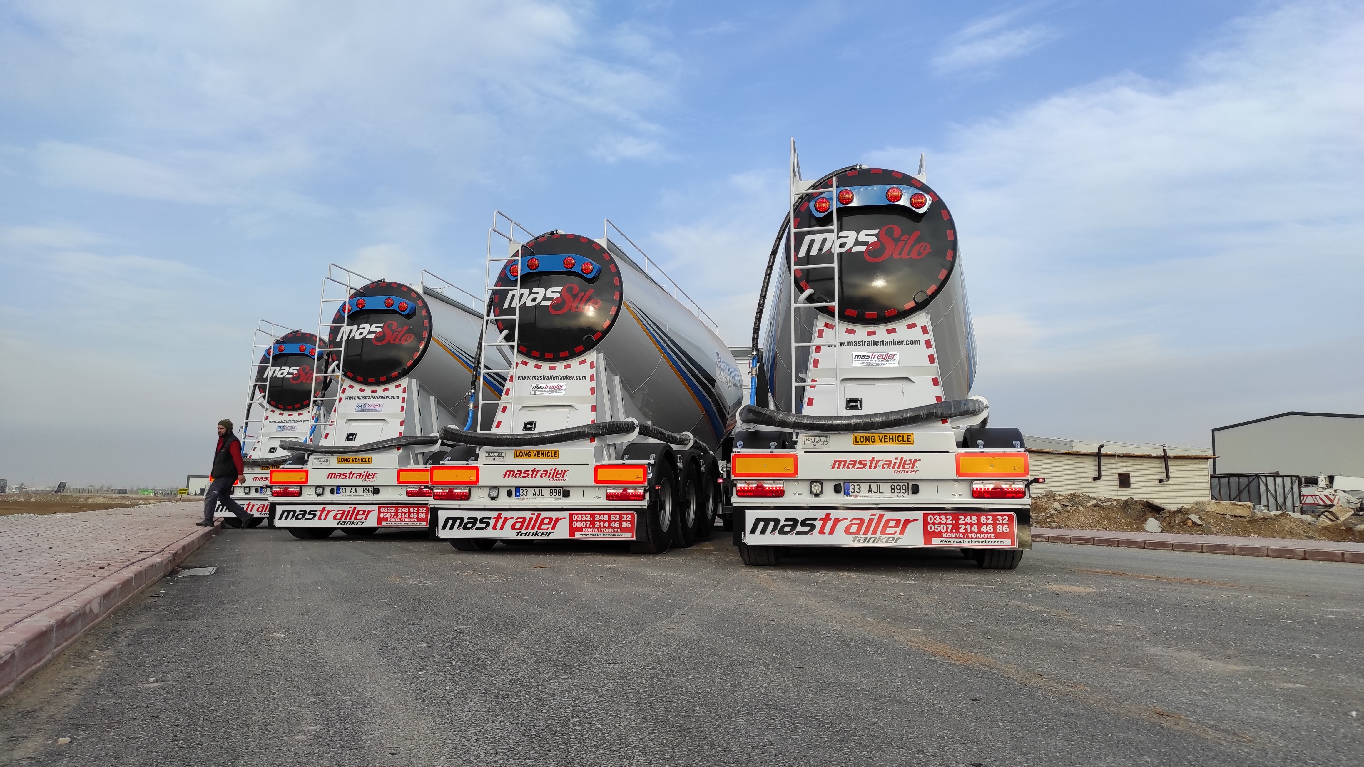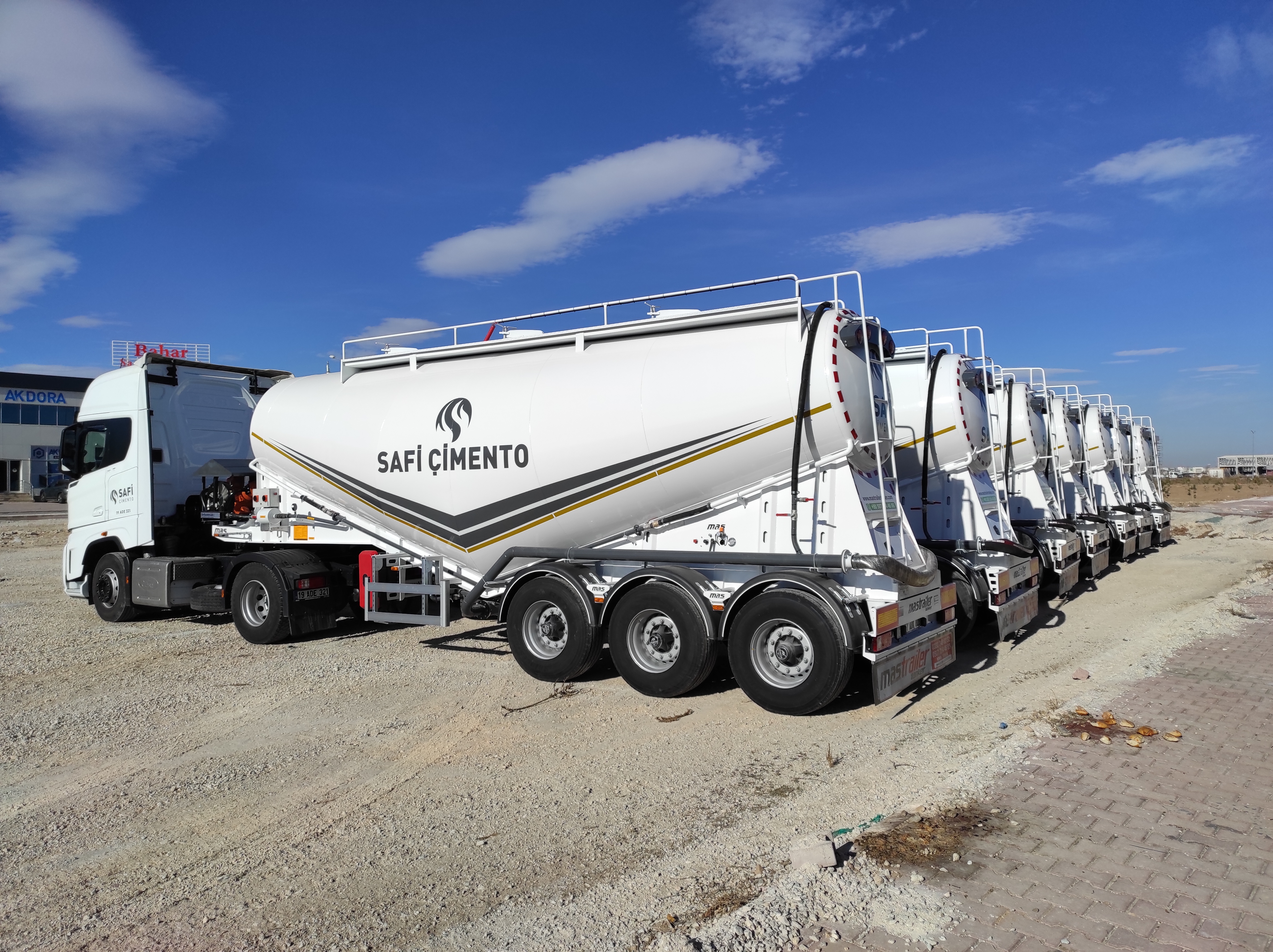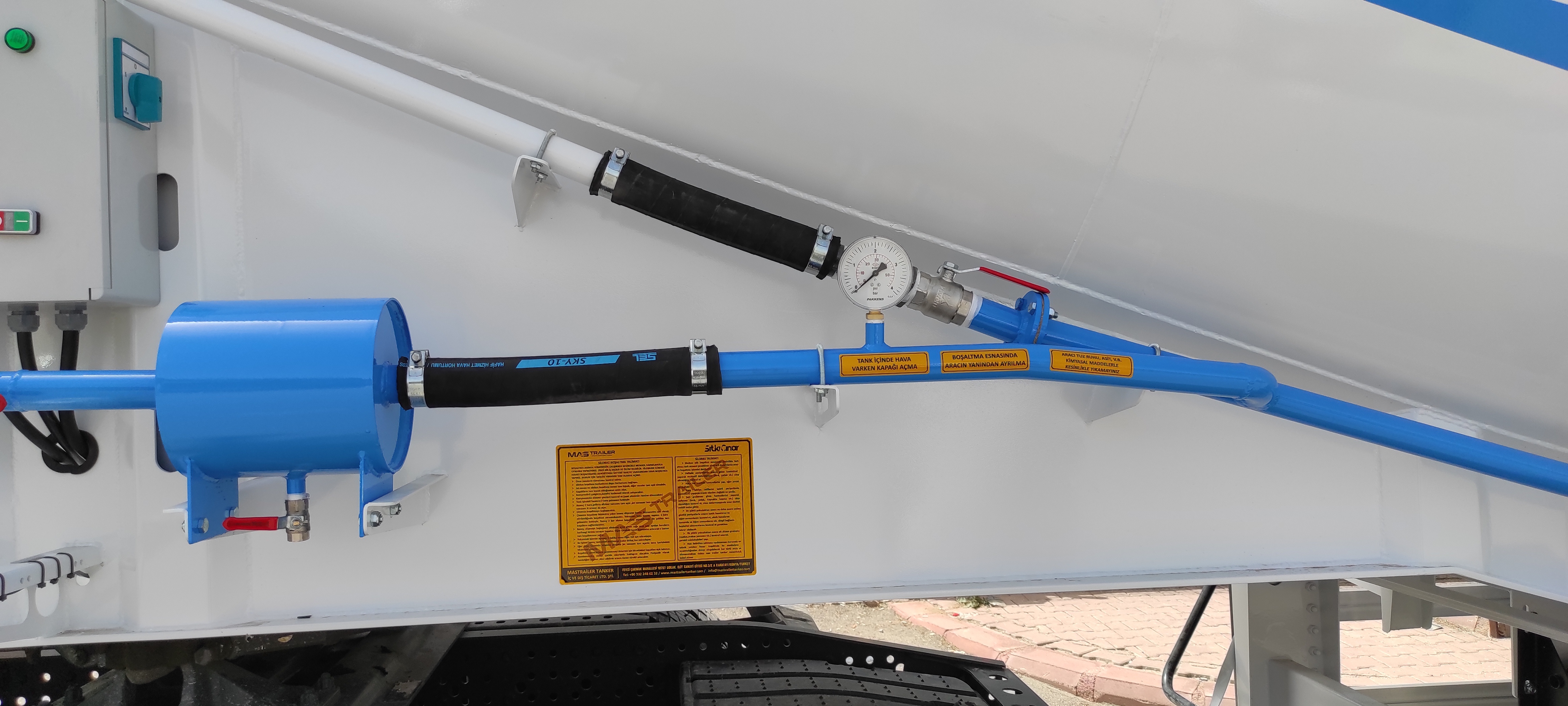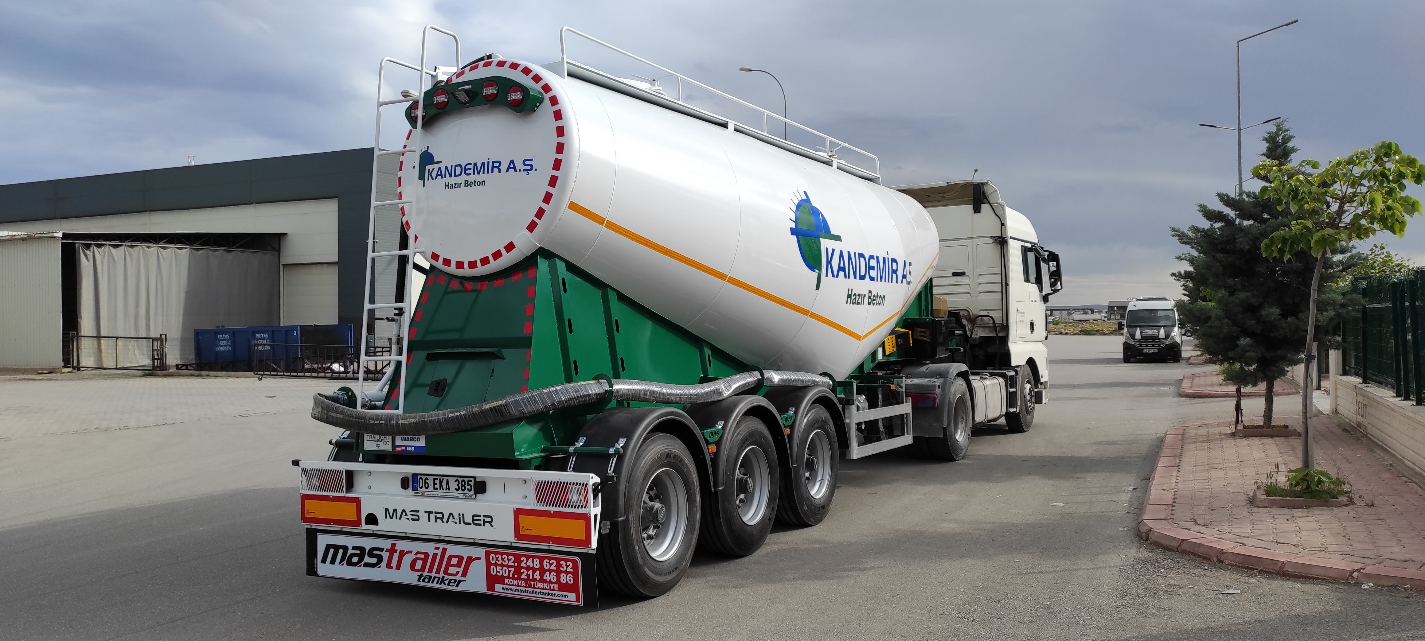 Brand Mas Trailer Tanker Model 2026 V Type Silobas Type: Silo Semi Trailer DIMENSIONS: Length: 10250mm Width: 2550 mm maximum Height: 3850mm Pin - ground clearance: 1,250 mm Distance between axles: 1310 mm BOILER FEATURES Volume : 30-32 m³ (38 tons) Type : V type bottom outlet Tank thickness : 4mm Working pressure : 2 bars Test pressure : 2.20 bars Discharge Time : 28 min. BODY FEATURES The tank material is manufactured from 6052 -6252 quality ERDEMİR or İSDEMİR flat steel. It is subjected to pressure and leakage tests before painting. COMPRESSOR BNB 102 Electric Compressor Confidence brand will be used. (2 Piston) BNB 72 Electric Compressor Confidence brand will be used. (3 Piston) Esinti 102-E Electric Compressor Bekomsan brand will be used. (2 Piston) Esinti 72-E Electric Compressor Bekomsan brand will be used. (3 Piston) G-220-2 E Electric Compressor Globaltech brand will be used. (2 Piston) G-160-3 E Electric Compressor Globaltech brand will be used. (3 Piston) The compressor has a motor protection star-stop panel. TANK EQUIPMENT 2 single-closing, test pressure resistant manhole covers, 450 mm in diameter 1 piece 4” Air controlled Pinch valve 1 air pressure manometer 1 piece ball jet air valve to accelerate discharge 1 piece with exit from the left rear of the vehicle4”wolf mouth connected discharge system 1 piece of safety valve set to 2.5 bar (On the body) Hose system with internal discharge air channel providing fluidity (13 rows) Axle: Three Turkish brand axles, each with a carrying capacity of 9 tons, are used. It has air suspension. The front axle is lifted and can be controlled from the driver's cabin. BRAKE SYSTEM: Knor or Wabco brand products are used in the brake equipment designed according to European rules. It is equipped with Automatic Brake Slack Adjusters, Brake Valve, Brake Chambers (30 cylinder), Brake Pads (394x200), Axle Brakes (4 Sensor 2 Module EBS system). There are 2 replaceable and protected brake sockets at the front of the trailer. 60+60 lt capacity air tank is installed. ELECTRICAL SYSTEM: Saba Brand 2x7 pin sockets - 24V, lights compliant with SAE standards. Rear stop lights, side marker lights, brake safety warning lights and signal lights will be installed. There will be 2 tail and stop combined lamps. 2 turn signal combination lamps will be installed 1 license plate light. The electrical system complies with European standards and is flame resistant. PARK FEET: OMS brand Parking Stands Telescopic, mechanical conveyor gear Dynamic Lifting Capacity : 25 Ton Static Lifting Capacity : 50 Ton Low Gear Position : 0.98 mm / Revolution TIRES AND RIMS: 385/65/R22.5STARMAX, PETLAS, Goodyear, Pirelli, Bridgestone (6 Pieces) 11.75 x 22.5, JANTSA rim (6 pieces) KING PIN: Turkish brand OMS will be used. It is a removable king pin from the bottom in 74080 standards and is made according to SAE standards as an 8-bolt type. It has an E certificate. PAINTING: All parts are carefully cleaned before painting. Epoxy is used for the first protective primer and coating. Two coats of high quality paint are applied to the tanker. The tanker will be painted white. It can be painted in any color desired. ACCESSORIES 1 piece4”in diameter6 metersneck discharge hose 2 platform walkways 1 tank material cabinet 1 metal tool cabinet 1 rear exit staircase 1 fire cabinet 1 water tank 30 lt 1 spare wheel space 1 wheel chock 6 pieces of Domar brand plastic mudguards Upper platform railing is raised and lowered with a pneumatic system pull button.