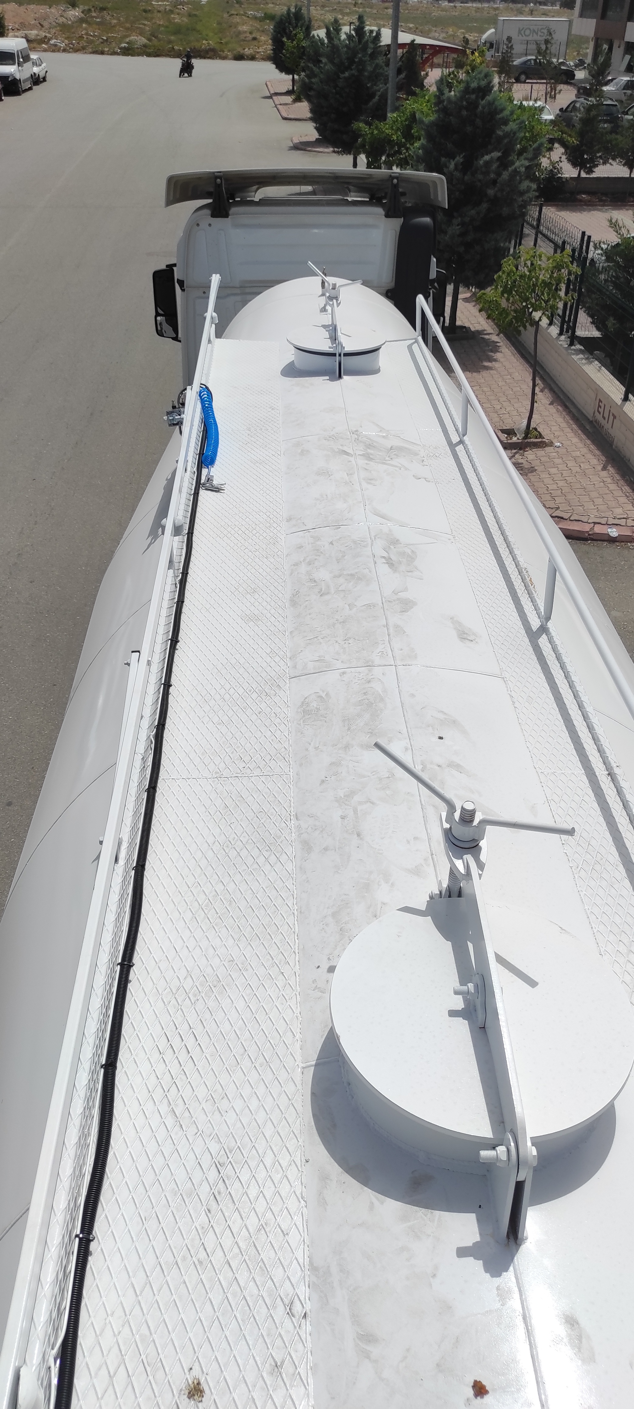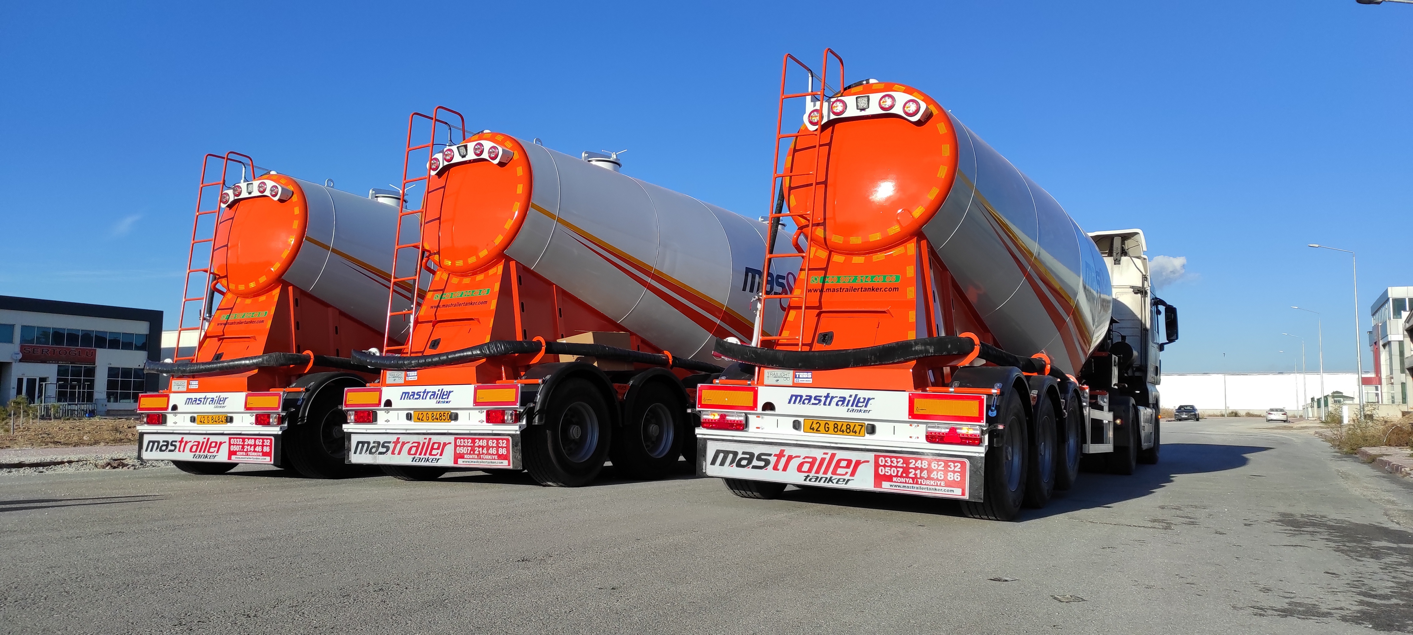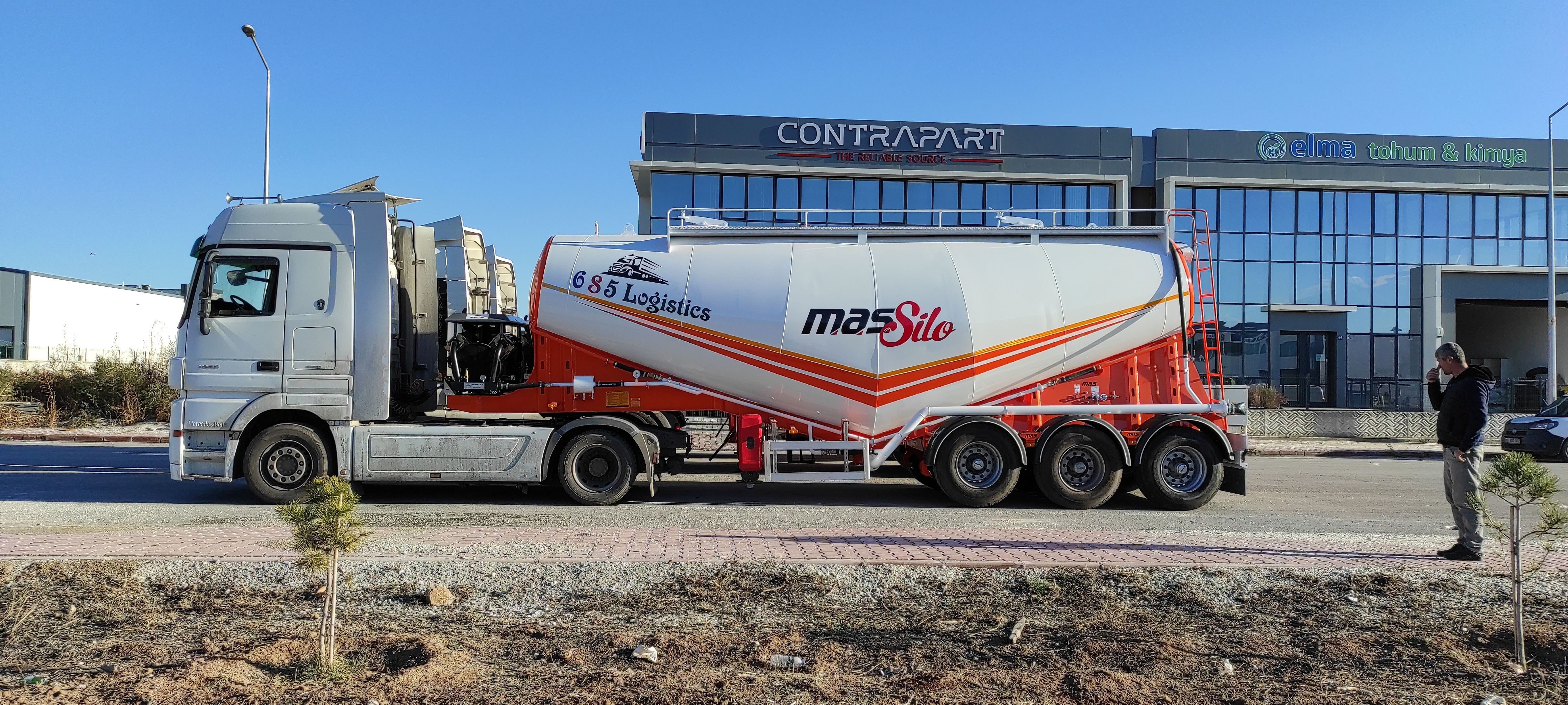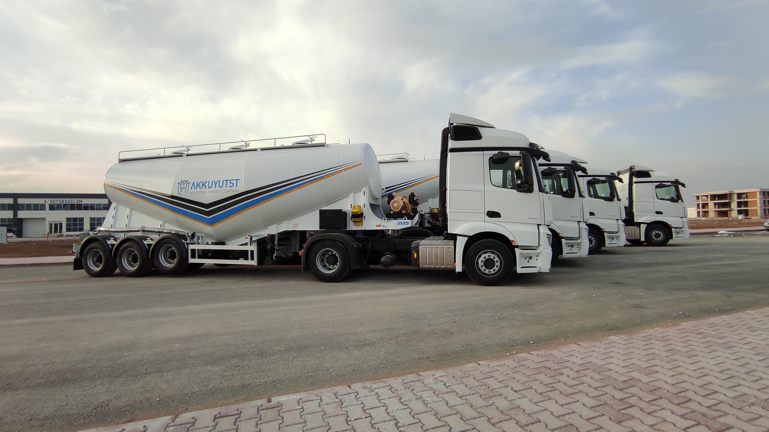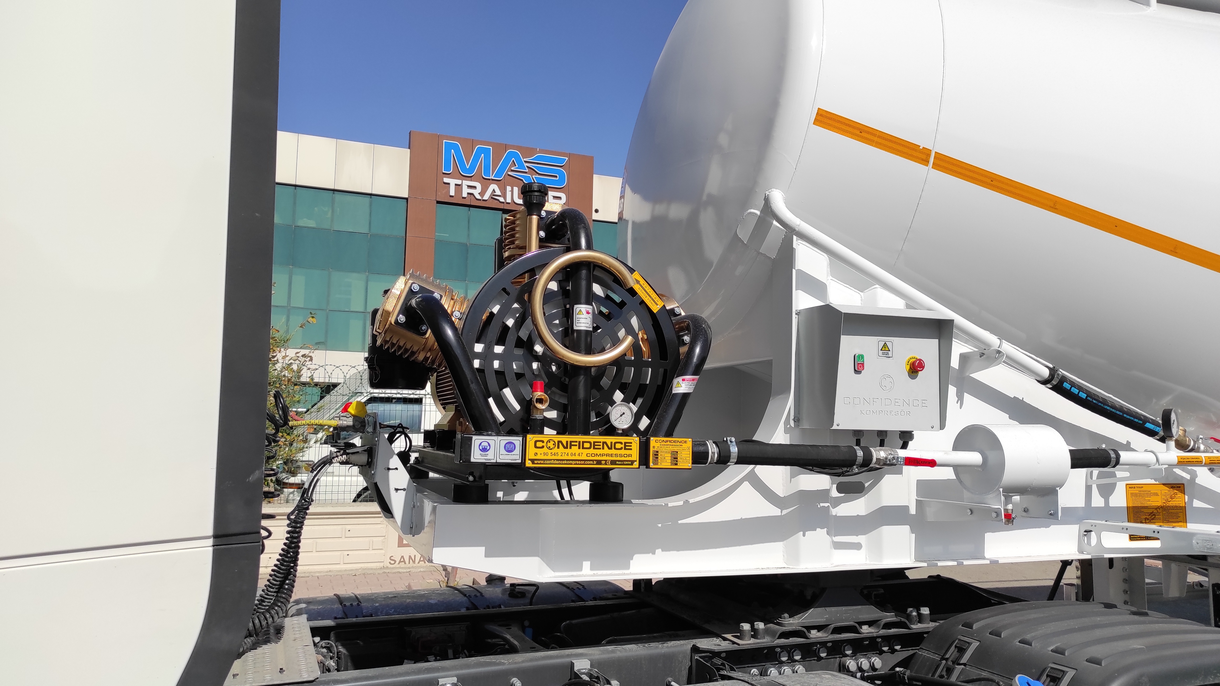 Brand Mas Trailer Tanker Model 2026 V Type Silobas Type: Silo Semi Trailer DIMENSIONS: Length: 10250mm Width: 2550 mm maximum Height: 3850mm Pin - ground clearance: 1,250 mm Distance between axles: 1310 mm BOILER FEATURES Volume : 30-32 m³ (38 tons) Type : V type bottom outlet Tank thickness : 4mm Working pressure : 2 bars Test pressure : 2.20 bars Discharge Time : 28 min. BODY FEATURES The tank material is manufactured from 6052 -6252 quality ERDEMİR or İSDEMİR flat steel. It is subjected to pressure and leakage tests before painting. COMPRESSOR BNB 102 Electric Compressor Confidence brand will be used. (2 Piston) BNB 72 Electric Compressor Confidence brand will be used. (3 Piston) Esinti 102-E Electric Compressor Bekomsan brand will be used. (2 Piston) Esinti 72-E Electric Compressor Bekomsan brand will be used. (3 Piston) G-220-2 E Electric Compressor Globaltech brand will be used. (2 Piston) G-160-3 E Electric Compressor Globaltech brand will be used. (3 Piston) The compressor has a motor protection star-stop panel. TANK EQUIPMENT 2 single-closing, test pressure resistant manhole covers, 450 mm in diameter 1 piece 4” Air controlled Pinch valve 1 air pressure manometer 1 piece ball jet air valve to accelerate discharge 1 piece with exit from the left rear of the vehicle4”wolf mouth connected discharge system 1 piece of safety valve set to 2.5 bar (On the body) Hose system with internal discharge air channel providing fluidity (13 rows) Axle: Three Turkish brand axles, each with a carrying capacity of 9 tons, are used. It has air suspension. The front axle is lifted and can be controlled from the driver's cabin. BRAKE SYSTEM: Knor or Wabco brand products are used in the brake equipment designed according to European rules. It is equipped with Automatic Brake Slack Adjusters, Brake Valve, Brake Chambers (30 cylinder), Brake Pads (394x200), Axle Brakes (4 Sensor 2 Module EBS system). There are 2 replaceable and protected brake sockets at the front of the trailer. 60+60 lt capacity air tank is installed. ELECTRICAL SYSTEM: Saba Brand 2x7 pin sockets - 24V, lights compliant with SAE standards. Rear stop lights, side marker lights, brake safety warning lights and signal lights will be installed. There will be 2 tail and stop combined lamps. 2 turn signal combination lamps will be installed 1 license plate light. The electrical system complies with European standards and is flame resistant. PARK FEET: OMS brand Parking Stands Telescopic, mechanical conveyor gear Dynamic Lifting Capacity : 25 Ton Static Lifting Capacity : 50 Ton Low Gear Position : 0.98 mm / Revolution TIRES AND RIMS: 385/65/R22.5STARMAX, PETLAS, Goodyear, Pirelli, Bridgestone (6 Pieces) 11.75 x 22.5, JANTSA rim (6 pieces) KING PIN: Turkish brand OMS will be used. It is a removable king pin from the bottom in 74080 standards and is made according to SAE standards as an 8-bolt type. It has an E certificate. PAINTING: All parts are carefully cleaned before painting. Epoxy is used for the first protective primer and coating. Two coats of high quality paint are applied to the tanker. The tanker will be painted white. It can be painted in any color desired. ACCESSORIES 1 piece4”in diameter6 metersneck discharge hose 2 platform walkways 1 tank material cabinet 1 metal tool cabinet 1 rear exit staircase 1 fire cabinet 1 water tank 30 lt 1 spare wheel space 1 wheel chock 6 pieces of Domar brand plastic mudguards Upper platform railing is raised and lowered with a pneumatic system pull button.