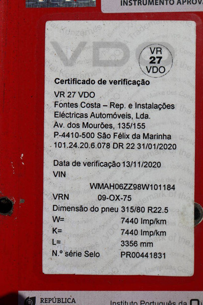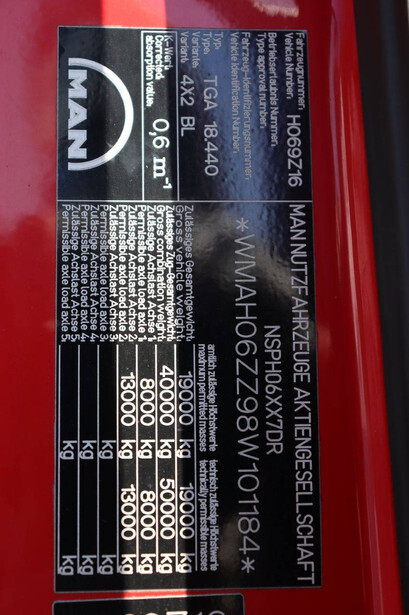 Brand: MAN Model: TGA 18.440 Chassis number: WMAH06ZZ98W101184 Fuel: Diesel Engine power: 440 HP Transmission: Manual Number of cylinders: 6 Color: red