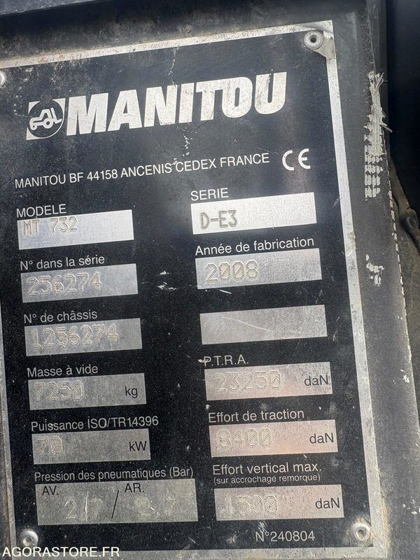 Manitou MT 732 Weight: 7250 Color: red Axle number: 2 FR: Type de véhicule TELESCOPIQUE Charge maximale: 3T2 Hauteur de travail max: 7m poids net à vide: 7250 carburant: GNR Fourche et godet Ref No:416786 VIN: D-E3/256274