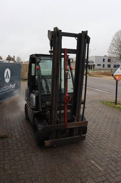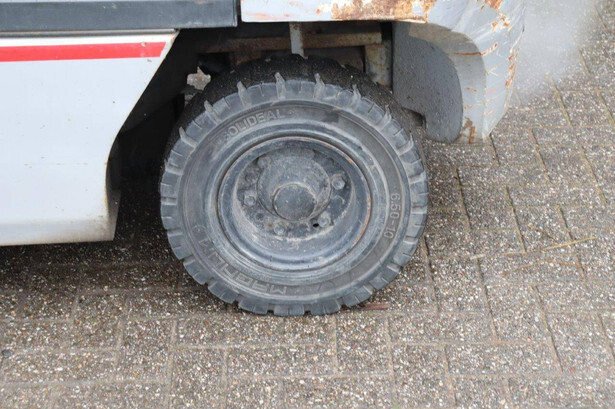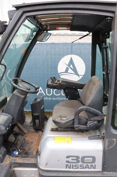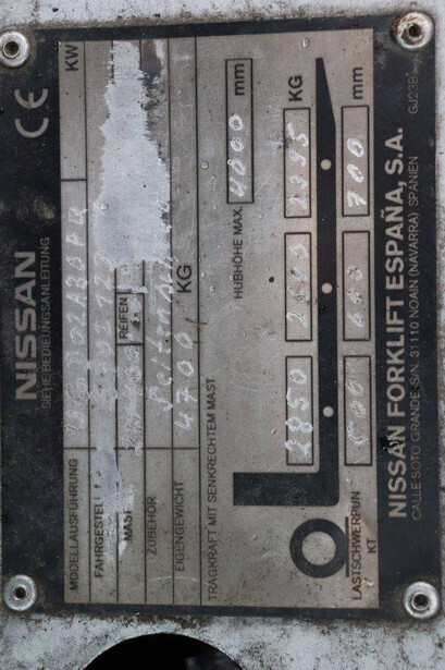 Brand: Nissan Type: 30 Serial number: 024388 Year of construction: Not known Fuel: LPG Mast type: Not known Sideshift: Yes Lifting capacity: 2850 kg Lifting height: 4000 mm Operating hours read: 8932 h Machine weight: 4700 kg Tires: Solid tires Color: gray