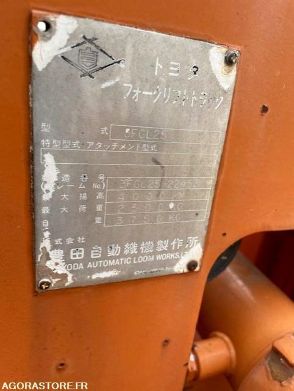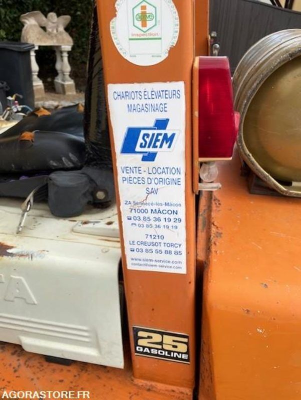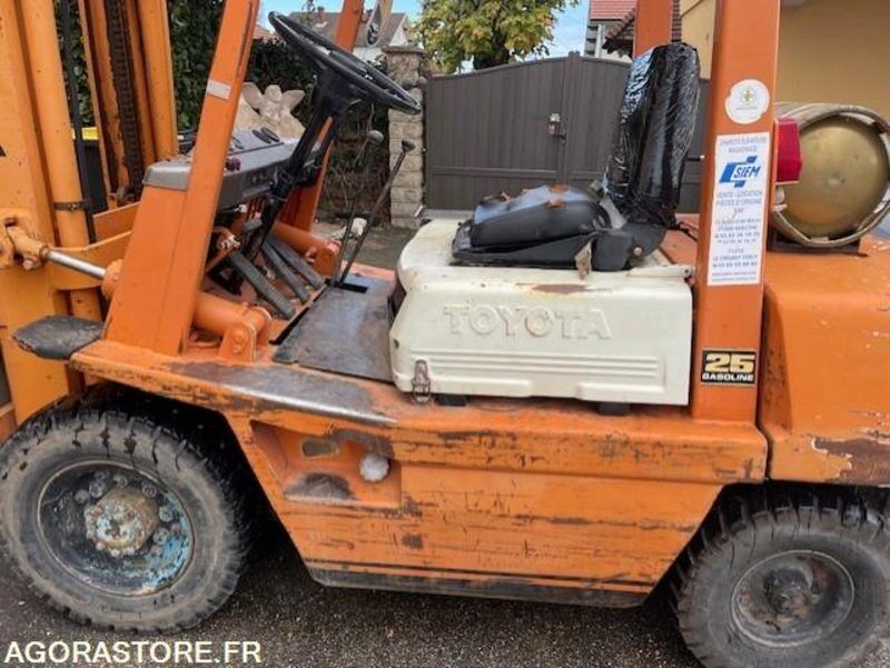 Toyota Color: orange Fuel: gas Axle number: 2 FR: IMPORTANT: TVA RECUPERABLE Caractéristiques techniques: gaz 2.5 TONNES Date de mise en service: 1990 Type produit: Chariot elevateur fen Chariot elevateur Toyota revisé a 4450 H prochaine revision prevue a 5450 H chariot Ancien mais robuste. Hydraulique marche parfaitement ( plusieurs videos a l appuie au travail ) possible envoie mail whattsap telephone Batterie Neuve siege en mauvaise etat Chariot alimentation Gaz Vendue en l'etat sans garantie chargement possible sur place Batterie neuve Ref No:RF49494