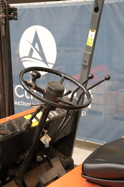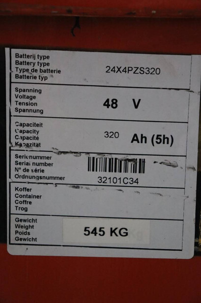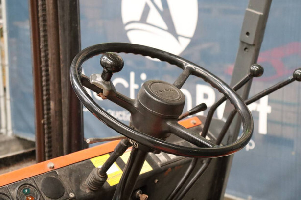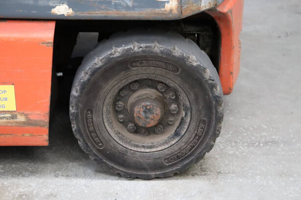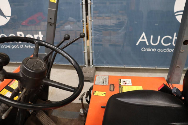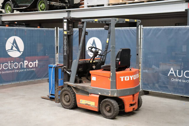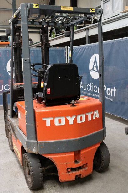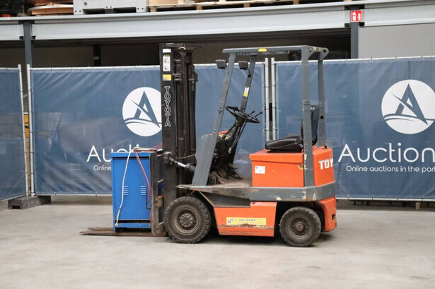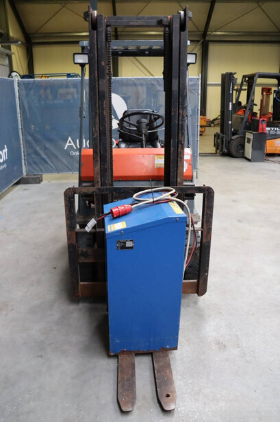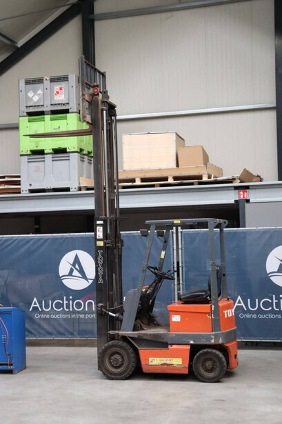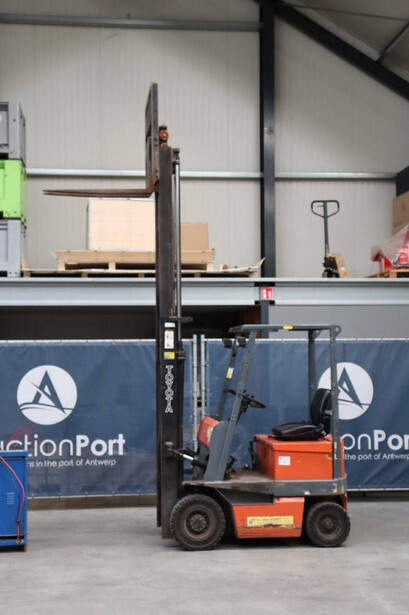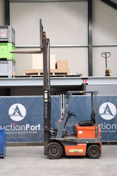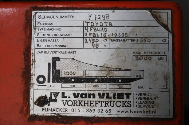Brand: Toyota Type: 4FBL10 Serial number: 4FBL15-10695 Fuel: Electric Mast type: Duplex Sideshift: No Lifting capacity: 1000 kg Lifting height: 3000 mm Machine weight: 3040 kg Tires: Solid tires Color: orange