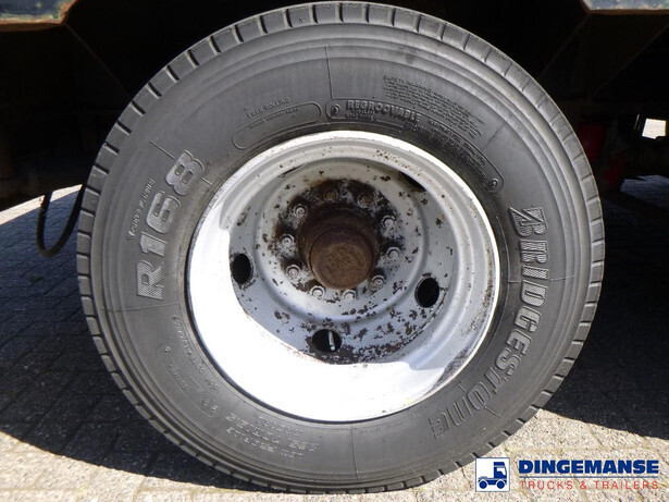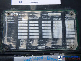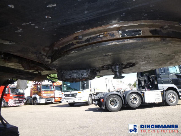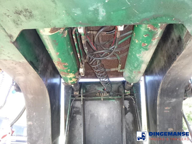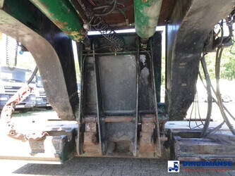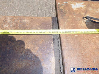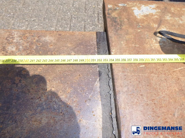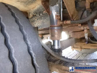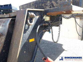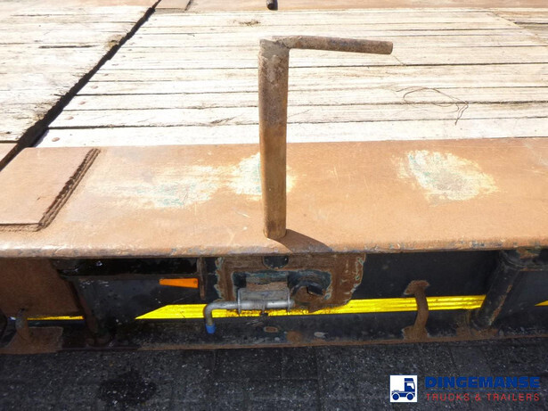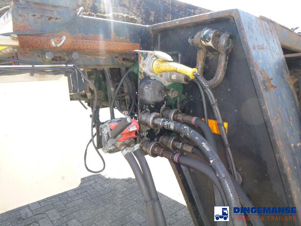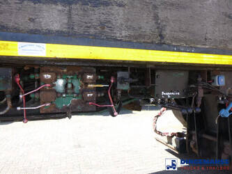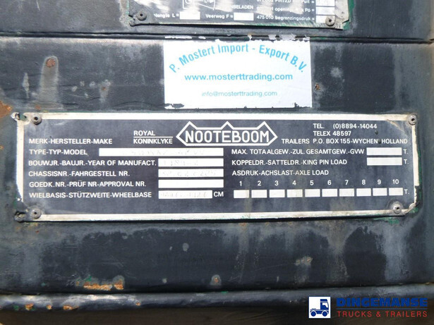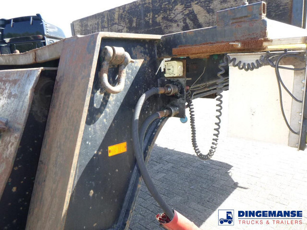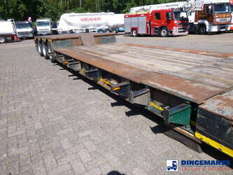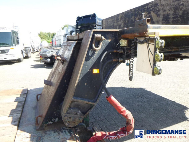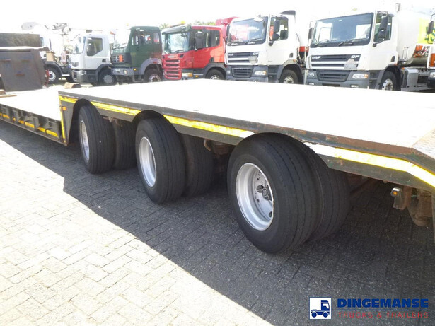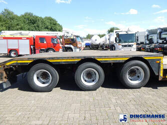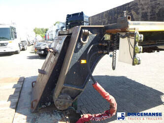 3-axle lowbed trailer with removable gooseneck, Max. gross weight 33000 kg, 3 Active steering axles, Hydraulic suspension, Dual tyres 285/70R19.5, BPW axles, Drum brakes, NO ABS, Cable remote control // DIMENSIONS // Min. low bed length 600 cm, Max. low bed length 855 cm (extends 255 cm), Low bed height 65 cm, Low bed width 275 cm (extendable to 300 cm with outriggers), Length over axles: 465 cm, Height over axles: 105 cm, Gooseneck length: 380 cm, Gooseneck height: 172 cm, Kingpin height: 130 cm, Kingpin diameter: 2 inches, Shipment dimensions (not extended): 1550x275x215 cm