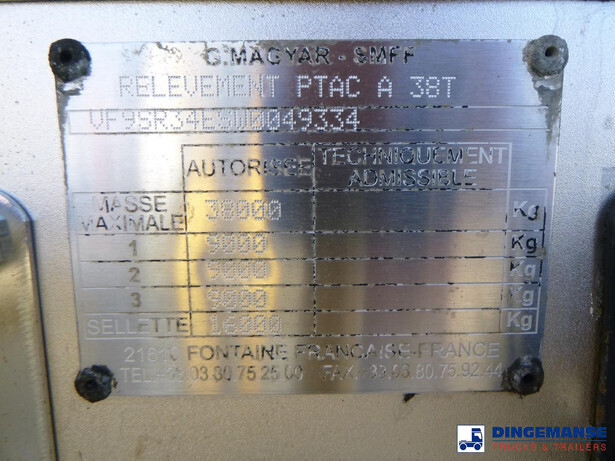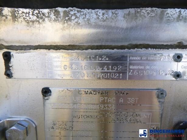 Magyar insulated stainless steel chemical tank, Capacity 33000 liters, 1 Compartment, Year of construction 1998, Tank material code Z6CNDT 17.1, Test pressure 4.0 bar, Max working pressure 2.0 bar, Air suspension, Drum brakes, ABS, Alloy wheels, Saf axles, Shipment dimensions 1300x250x360 cm