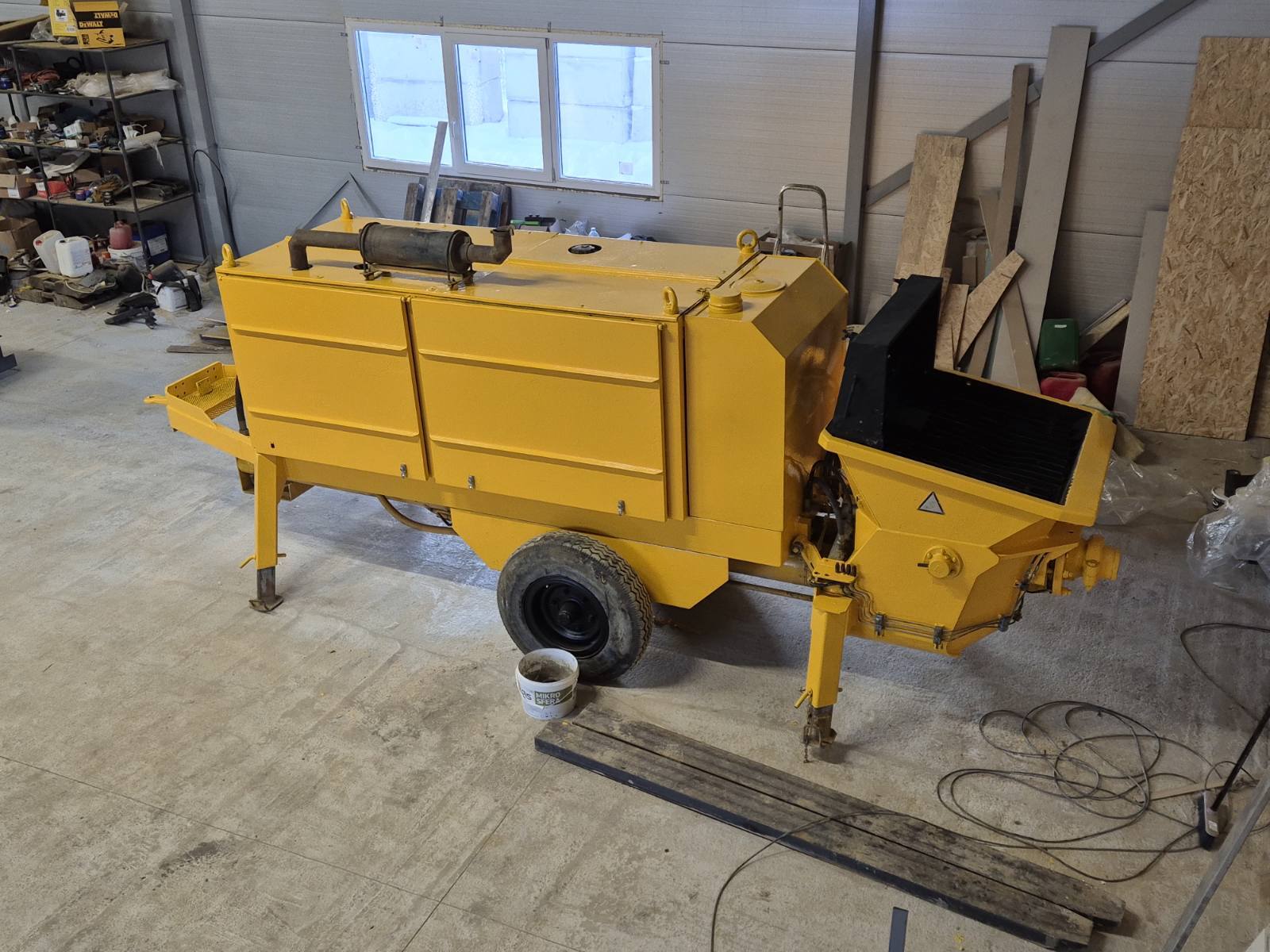 The kit includes several pump hoses and metal pipes. On the wheels, there is a towing loop. Can be towed around the construction site.