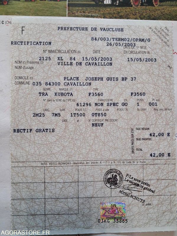 Kubota F3560 Color: orange Power: 31.27 Engine volume: 1498 Cylinder count: 4 Axle number: 2 FR: Date et lieu de visite: Pas de visite sur place Etat général: La tondeuse est roulante et disponible immédiatement Caractéristiques techniques: FRONTALE cylindrée : 1498 cm3 PLATEAU WIEDENMANN - Éjection : Mulching - Nombre de lames : 3 - Largeur de coupe : 1.5 m - Hauteur de coupe : de ? à ? mm. - Poids : ? Kgs Largeur de coupe: 1.5 m Type produit: TONDEUSE AUTOPORTEE carburant: GO Bon état de marche siège déchiré Ref No:UL48145