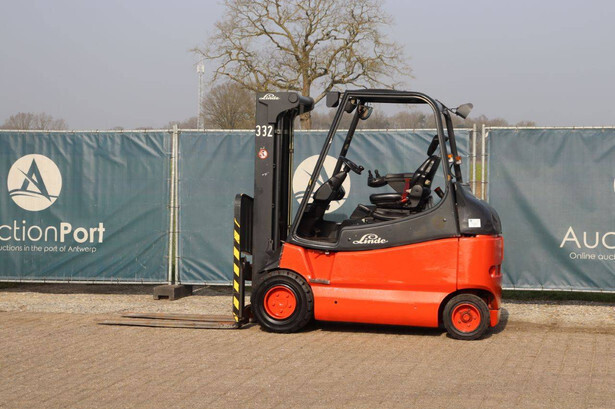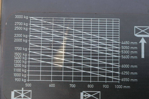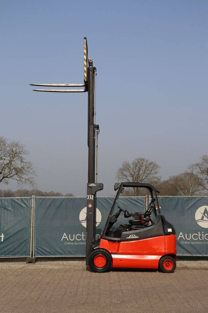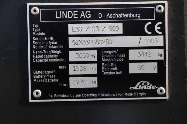 Brand: Linde Type: E30 Serial number: G1X336S50250 Year of construction: 2005 Fuel: Electric Mast type: Triplex Sideshift: No Lifting capacity: 3000 kg Lifting height: 6550 mm Reading operating hours: 181638 h Machine weight: 5398 kg Tires: Solid tires Color: red