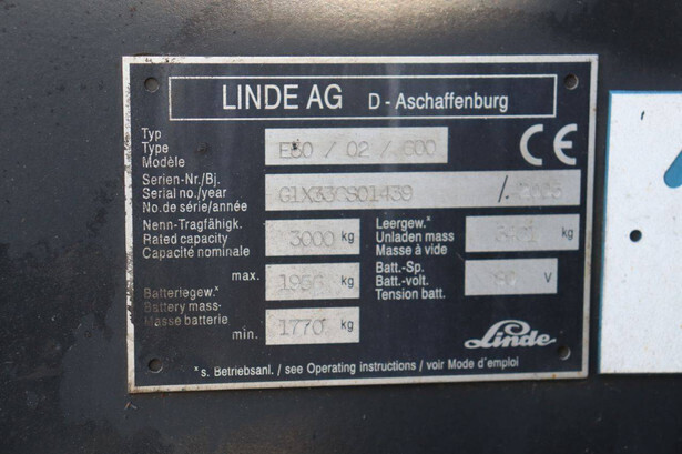 Brand: Linde Type: E30 Serial number: G1X33CS01439 Year of construction: 2005 Fuel: Electric Mast type: Plywood Sideshift: No Lifting capacity: 3000 kg Lifting height: 6000 mm Recorded operating hours: 13,642 hours Tires: Solid tires Color: blue