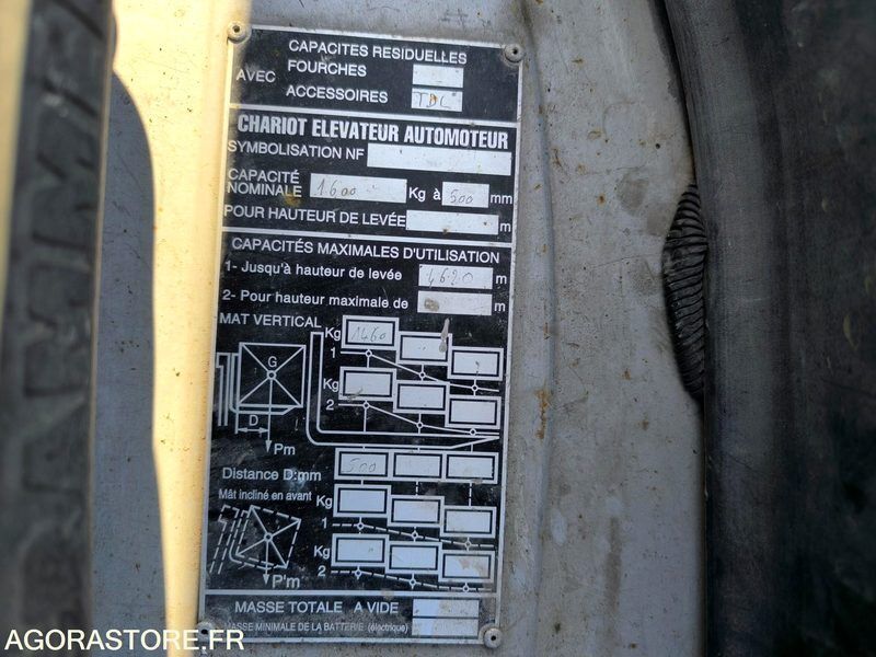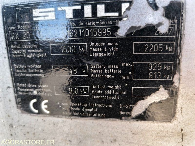 Still RX 20-16 Weight: 2200 Power: 12.24 Fuel: electro FR: Type de véhicule Chariot élévateur électrique IMPORTANT: Chariot élévateur fonctionne parfaitement ! Charge maximale: 1.6 Hauteur de travail max: 4.62 Ecarteur de fourches Positionneur de fourches Tablier à Déplacement Latéral Mât Triplex Modèle : RX 20-16 Heures : 8888 H au compteur Pneus AV MAGNUM : 18X7-8 Pneus AR CONTINENTAL : 125/75-8 Masse à vide : 2.2 Tonnes Capacité : 1.6 Tonnes Levé libre : 2.00 m Longueur des fourches : 1.2 M Ecarteur de fourches Positionneur de fourches Tablier à Déplacement Latéral Mât Triplex Phares de travail Ref No:AP49171