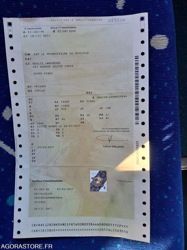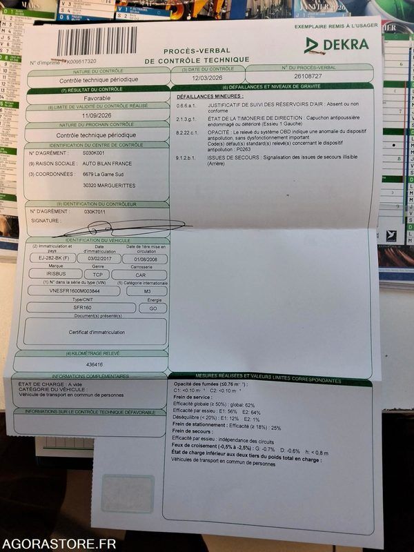 FR: Type de véhicule AUTOCAR IMPORTANT: VEHICULE ROULANT Etat carrosserie: MOYEN Etat des pneus: Usure 70% (valeur des pneus : 750€) Cylindrée: Moteur : Euro 5 Ceinture: Avec ceintures Climatisation: Avec climatisation + Chauffage Toilettes: Sans Etat moteur boite pont: Etat moteur : Très bon ; Etat mécanique : Très bon PMR: Rampe PMR Webasto: Avec climatisation + Chauffage Dernier passage aux mines: 46093 Ethylotest: Avec éthylotest Autoradio + Rampe PMR Etat général : BON