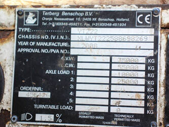 Brand: Terberg Type: YT222 Serial number: XLWYT222588698269 Year of construction: 2008 Fuel: Diesel Engine power: 222 HP Capacity: 10000 kg Machine weight: 35,000 kg Tires: Solid tires Color: white