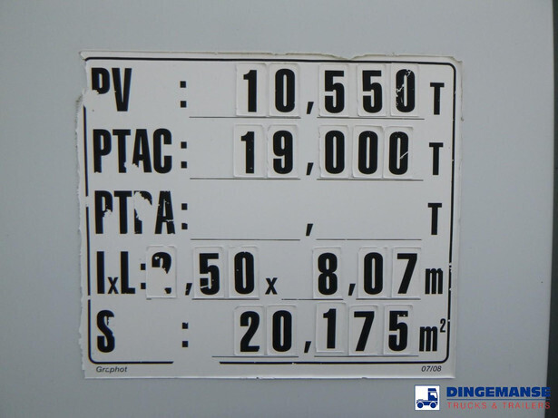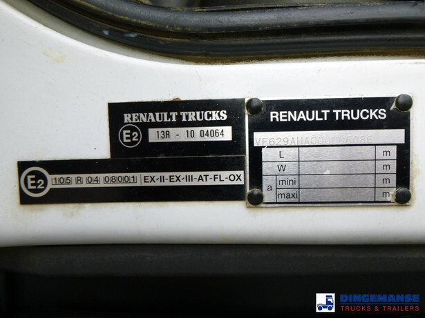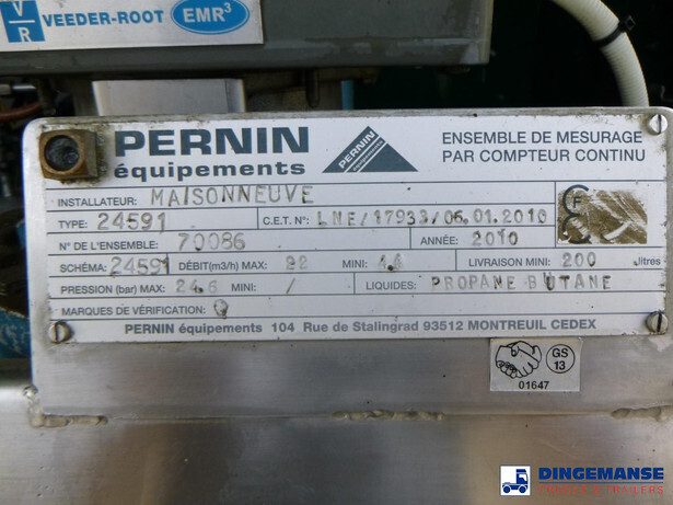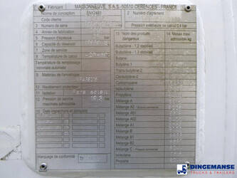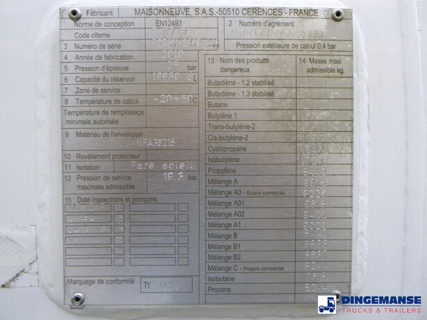 Maisonneuve LPG tank, Capacity 19751 litres, Blackmer hydraulic discharge pump, Pernin flow meter, Hose reel, Test pressure 25 bar, Max. working pressure 19.3 bar // Truck Euro 5, AdBlue, Steel suspension front, Air suspension, rear, Manual gearbox (8 gears), Tyres 315/70R22.5, Alloy wheels, Day cab, Air conditioning, Shipment dimensions 810x250x360 cm