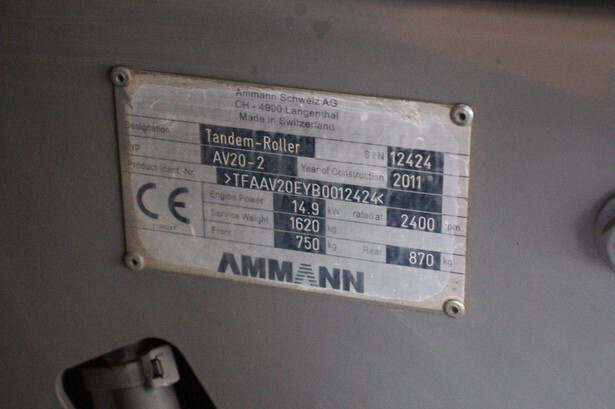 Brand: Ammann Type: AV20-2 Serial number: 12424 Year of construction: 2011 Fuel: Diesel Engine power: 14.9 kW Reading operating hours: 1628 h Machine weight: 1620 kg Color: red