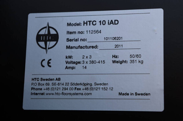 Brand: HTC Type: 10iAD Serial number: 101106201 Year of construction: 2011 Fuel: Electric Engine power: 3 kW Voltage: 415 V Current: 14 A Frequency: 50/60 Hz Weight: 351 kg Color: black