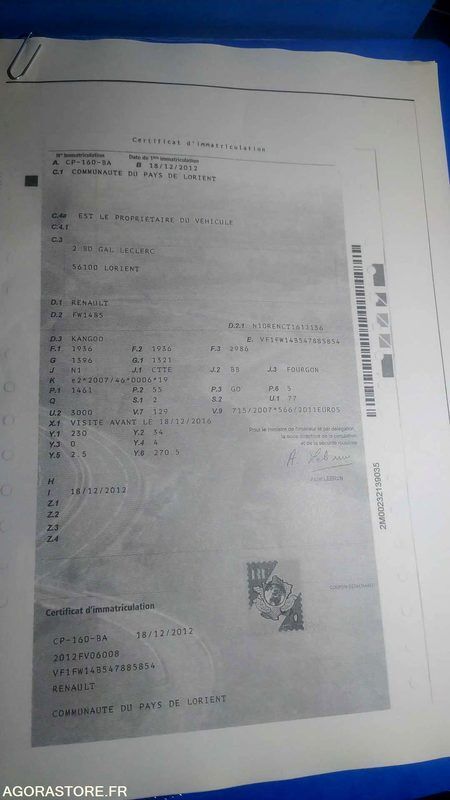 Renault KANGOO Color: white Power: 75 Engine volume: 1461 Fuel: gas Axle 1 common tyre size: 195/65/15 Gearbox type: manual Overall height: 1.81 Overall length: 4.28 Overall width: 1.83 FR: Type de véhicule FOURGONNETTE Nb portes: 4 Etat carrosserie: Bon à defloquer Etat intérieur: Propre à nettoyer Etat des pneus: Bon Transmission: AVANT Version: GD DCI Etat soubassements: Bon Véhicule roulant Moteur tournant Un rapport d'inventaire est fourni dans la rubrique « documents » Ref No:QJ48984 VIN: VF1FW14B547885854