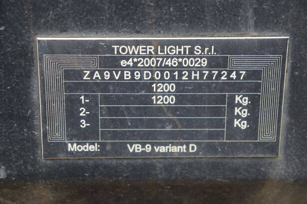 Brand: Towerlight Type: VB-9 Year of construction: 2012 Serial number: 1204906 Fuel: Gasoline Power: 1.6kW Operating hours read: 7543 h Machine weight: 860 kg Color: blue
