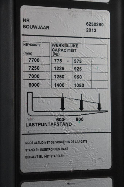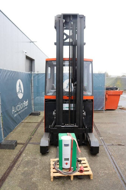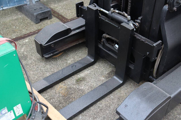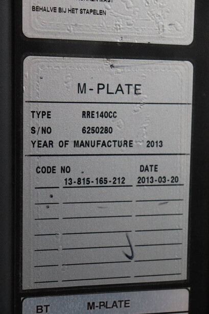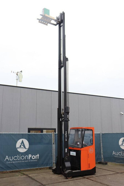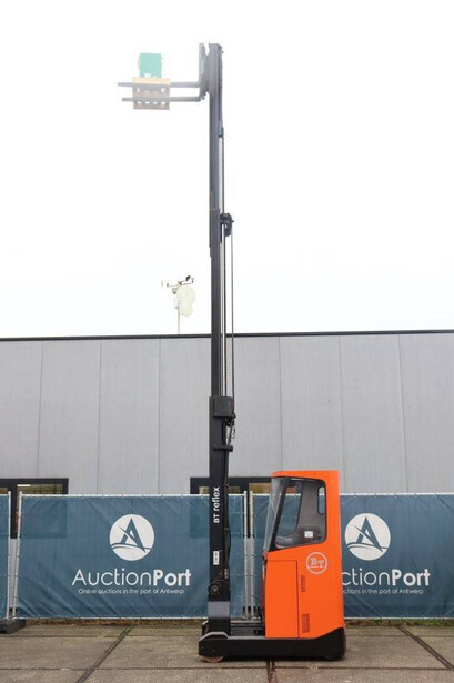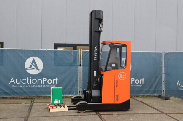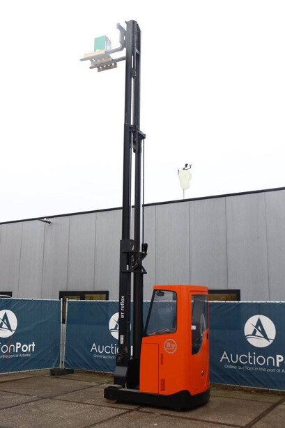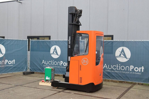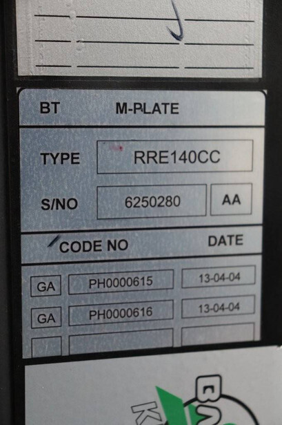 Brand: BT Type: RRE140CC Serial number: 6250280 Year of construction: 2013 Fuel: Electric Mast type: Triplex Sideshift: Yes Lifting capacity: 1400 kg Lifting height: 7700 mm Operating hours read: 10973 h Machine weight: 4210 kg Color: orange