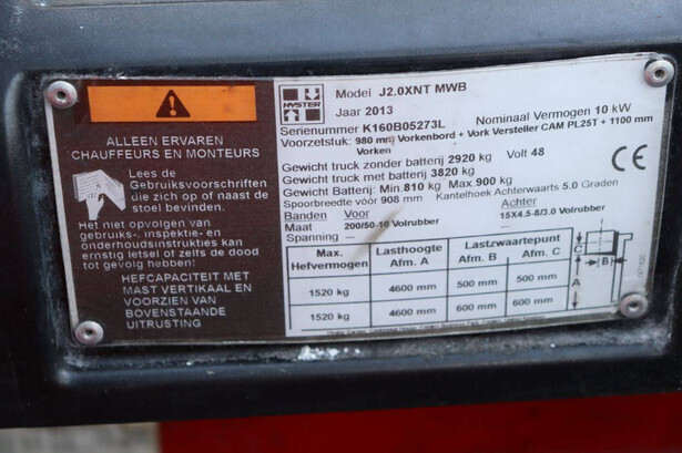 Brand: Hyster Type: J2.0XNT MWB Serial number: K160B05273L Year of construction: 2013 Fuel: Electric Mast type: Triplex Sideshift: No Lifting capacity: 1520 kg Lifting height: 4600 mm Operating hours read: 7476 h Machine weight: 3820 kg Tires: Solid tires Color: red
