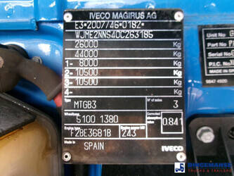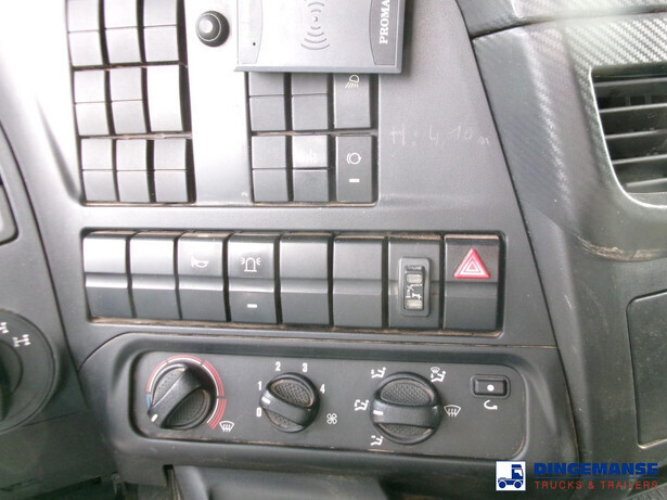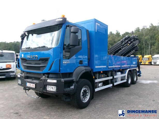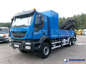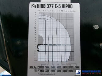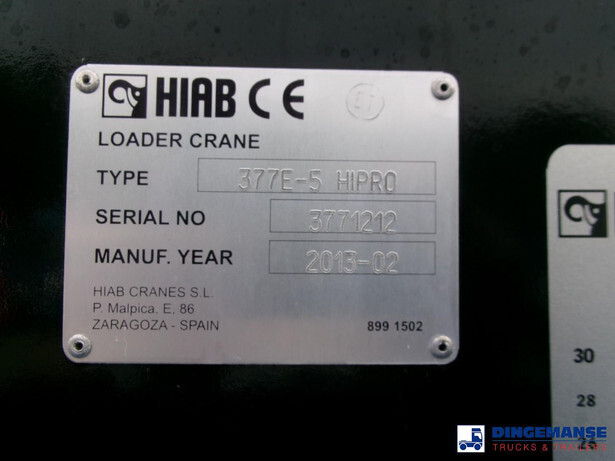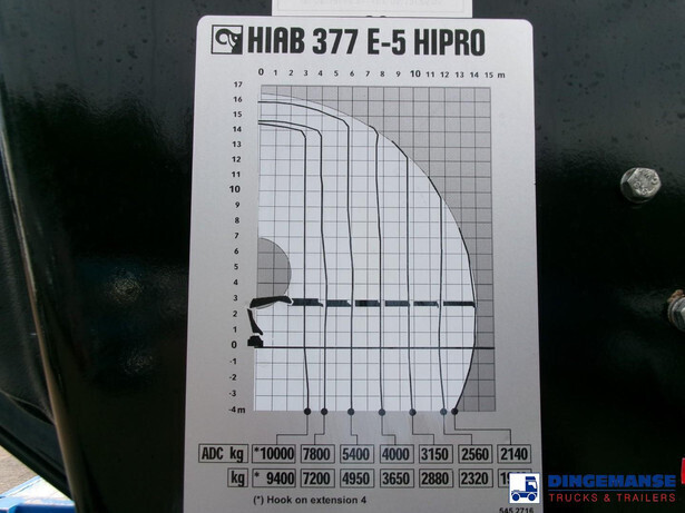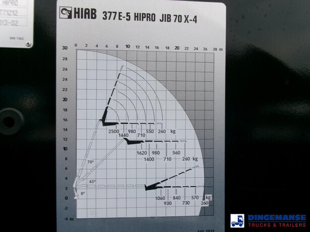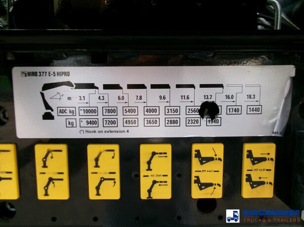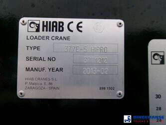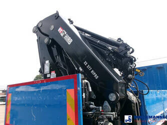 Hiab 377 E5 Hipro Jib 70 X-4 loading crane, 5 hydraulic extensions on main crane, 4 hydraulic extensions on jib, 1 manual extension on jib, Max reach 13.70 meters on main crane 28.00 meters on jib, Max loading capacities 7200 kg at 4.30 m, 4950 kg at 6.00 m, 3650 kg at 7.80 m, 2880 kg at 9.6 m, 2320 kg at 11.60 m, 1940 kg at 13.70 m (main crane) 610 kg at 19 m, 550 kg at 23 m, 500 kg at 24.80 m, 450 kg at 26.30 m ( hydraulic extensions on jib) 400 kg at 28 m (manual extention on jib), Year of construction 2013. 4 support legs, Radio control, Rotator // Truck 6x4, Euro 5, Adblue, Manual gearbox with 16 gears, Diff. lock, Full steel suspension, Rockinger hitch, Loading height superstructure 140 cm, Day cabin, Digital tachograph, Shipment dimensions 800x255x395 cm