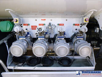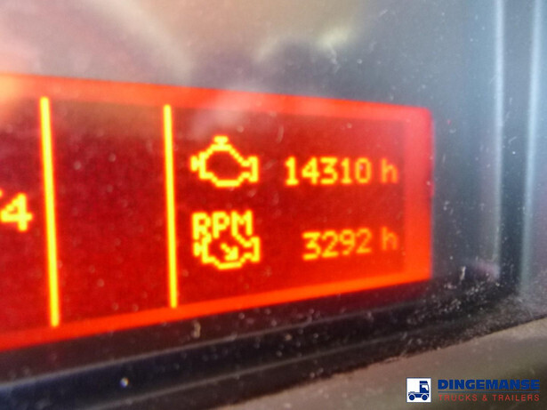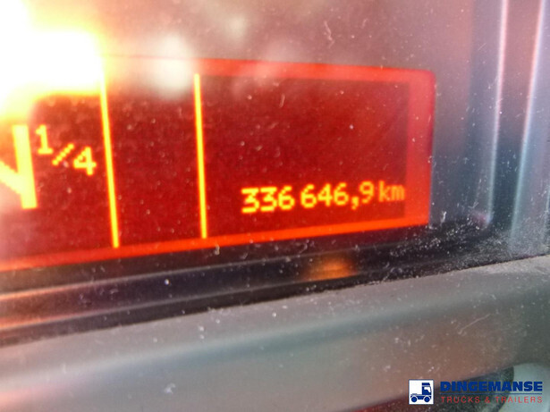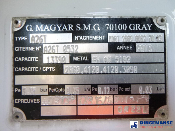 Magyar aluminium fuel tank, Capacity 13390 netto / 13000 nominal, 4 Compartments (2060;4120;4120;3090 netto // 2000;4000;4000;3000 nominal), Tank material code EN AW 5182, Year of construction 2013, Test pressure 0.35 bar, Max working pressure 0.12 bar, Hydraulic discharge pump, Digital counter, Hose reel, Overload sensor, Vapour recovery // Truck 4x2, Euro 5, Adblue, Manual gearbox with 8 gears, Diff lock, Full air suspension, Dxi engine, Day cabin, Airconditioning, Digital tachograph, Shipment dimensions 730x250x335 cm