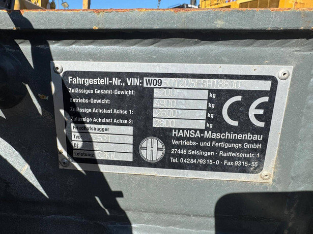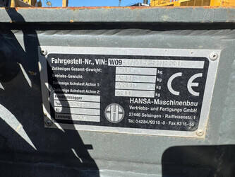 Brand: Hansa Type: APZ531 Serial number: W09501205ESH18630 Year of construction: 2014 Fuel: Diesel Engine power: 72 kW Quick change: No Operating hours read: Not known Machine weight: 4900 kg Chassis: Wheels Color: green