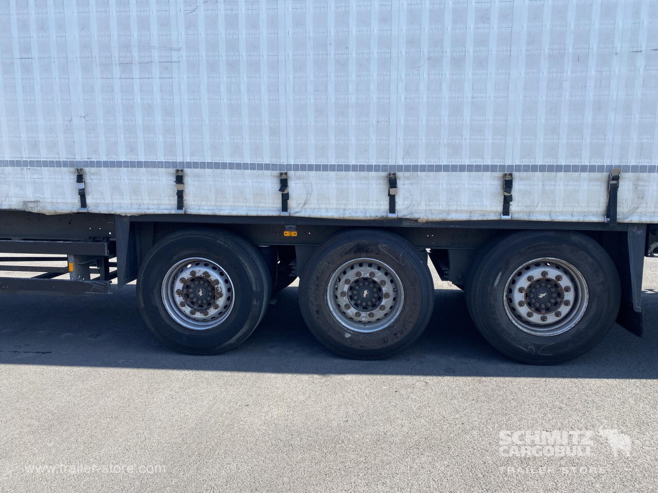 Remarks: **Safety**\\Rear underrun, Antilock Braking System ABS, Fire extinguisher holder\\\\**Exterior**\\Air suspension, Toolbox, Spare wheel carrier, Bolted chassis, Sliding roof, 1x15 and 2x7 pin plug, Antispray\\\\**Cargo securing**\\Cargo securing with certificate, DIN EN 12642 (code XL) certificate, Punched load securing side rave, Wooden - support slats\\\\**Brake system**\\Disc brake, Schmitz ROTOS\\\\**Floor**\\Wooden floor, Lashing rings in floor\\\\**Loading area**\\Length 13.620 mm, Width 2.480 mm, Height 2.700 mm, Volume 91 m³\\\\**Tyre sizes**\\1. Achse: 385/65 R22.5 , Tread depth: 7 mm / 7 mm, 2. Achse: 385/65 R22.5 , Tread depth: 9 mm / 9 mm, 3. Achse: 385/65 R22.5 , Tread depth: 14 mm / 14 mm\\\\**Other dimensions and weights**\\GVW: 38.000 kg\\\\----