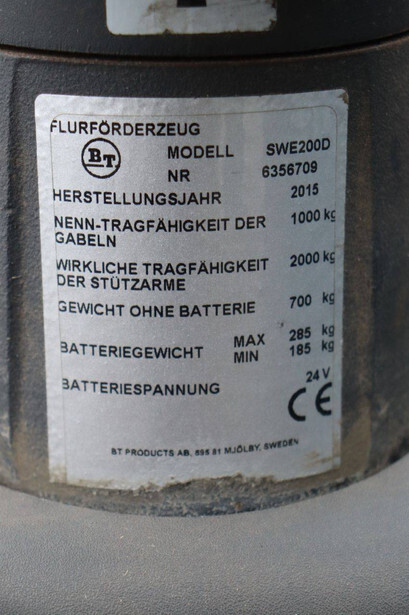Brand: BT Type: SWE200D Serial number: 6356709 Year of construction: 2015 Fuel: Electric Mast type: Duplex Lifting capacity: 2000 kg Operating hours read: 541 h Machine weight: 985 kg Color: red