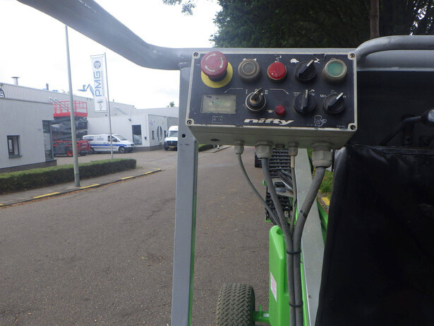 Brand: Nifty Model: HR12NDE Type: Articulated boom lift Serial number: 12-31767 Year of construction: 2015 Read operating hours: no counter Fuel: Bi-energy, battery + Kubota diesel engine Working height: 12.20m Lateral reach: 6.10m Lifting capacity: 200kg Machine weight: 3550kg Wheels: Non-marking tires Drive: 24V+ Kubota diesel engine